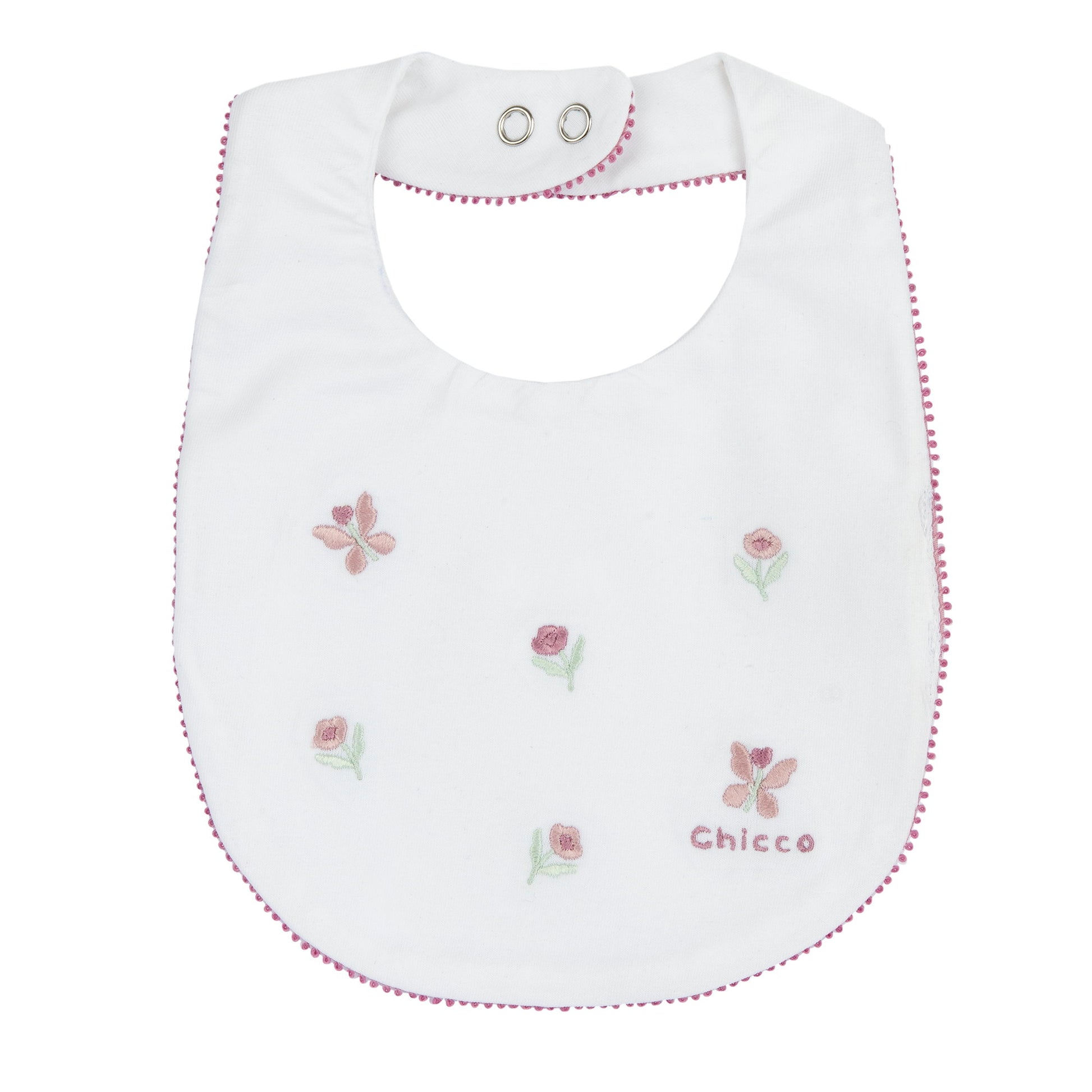 Bavaglio neonata bianco con ricamo di fiori e farfalle .Chiusura con clip