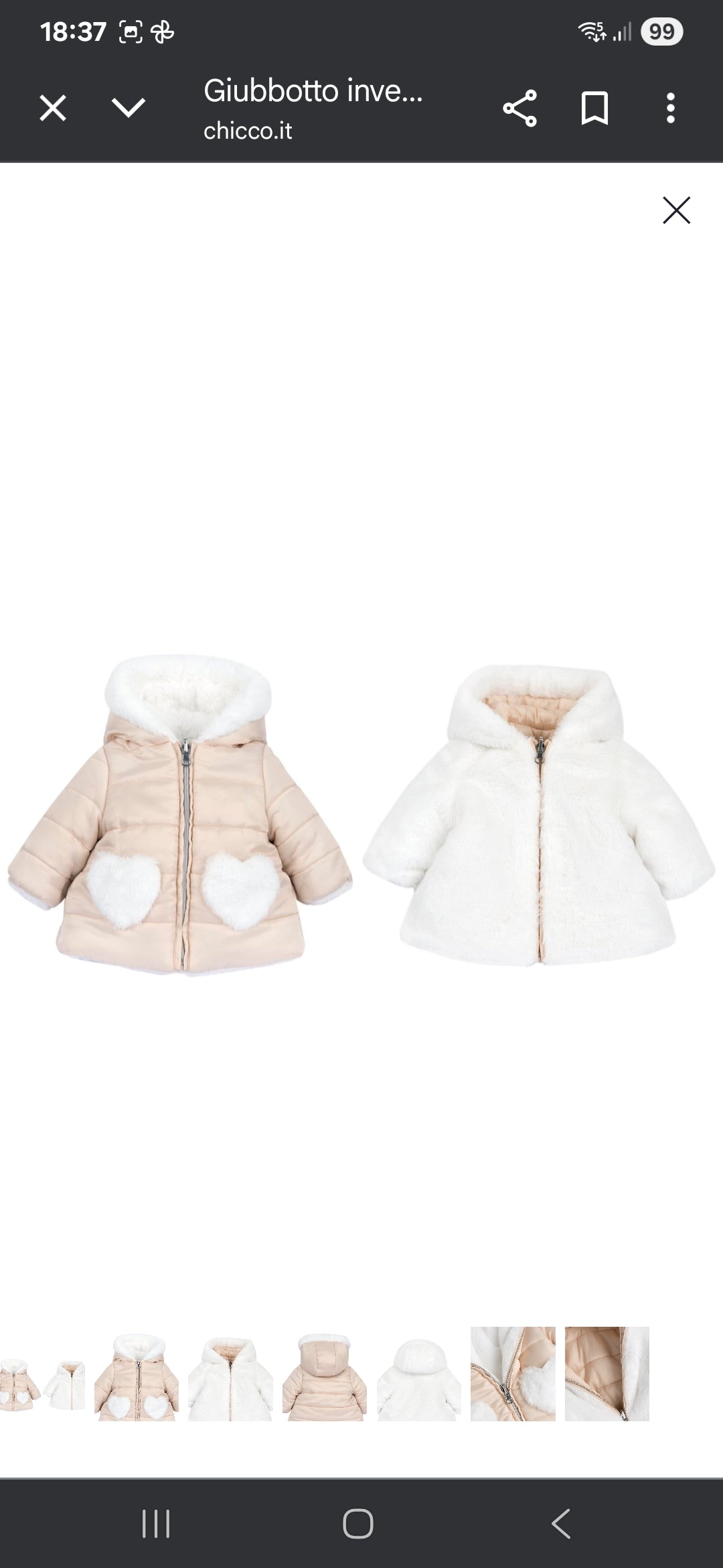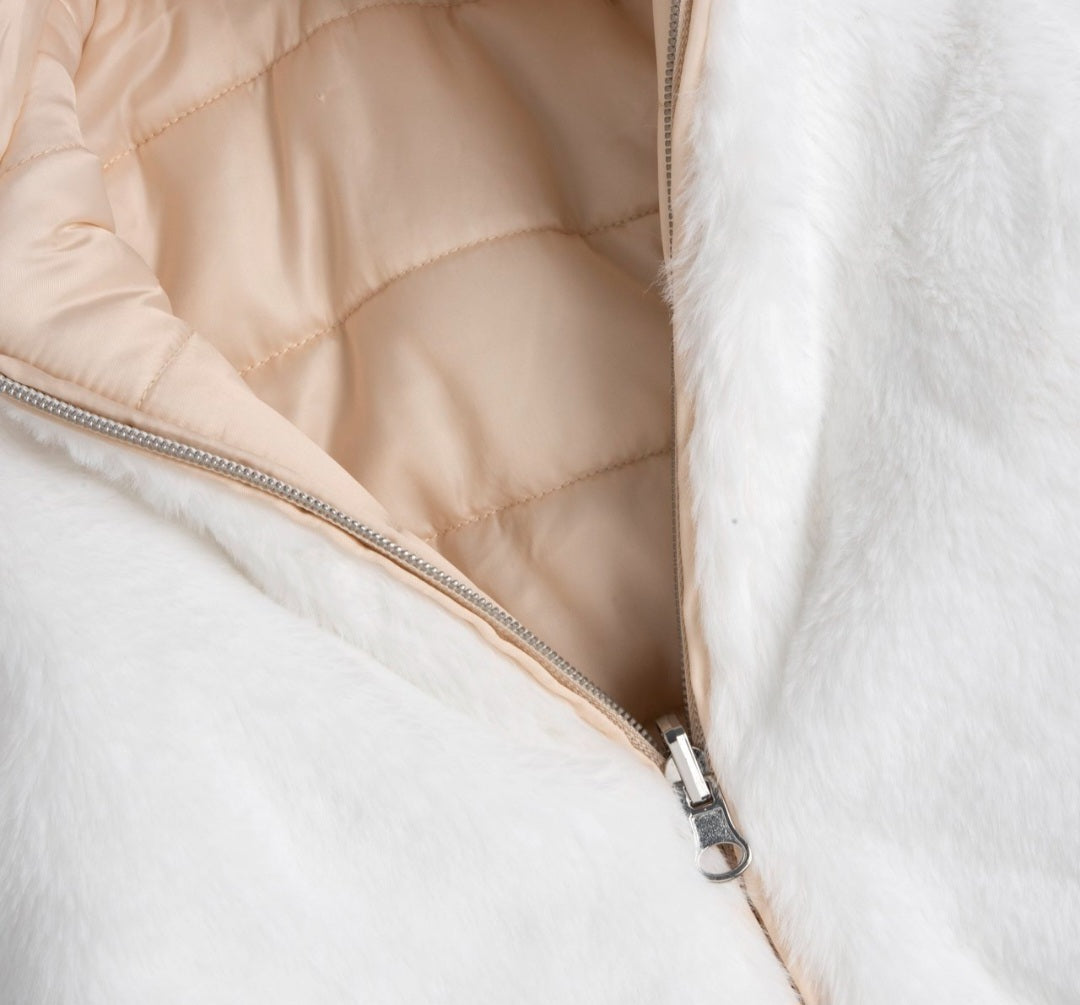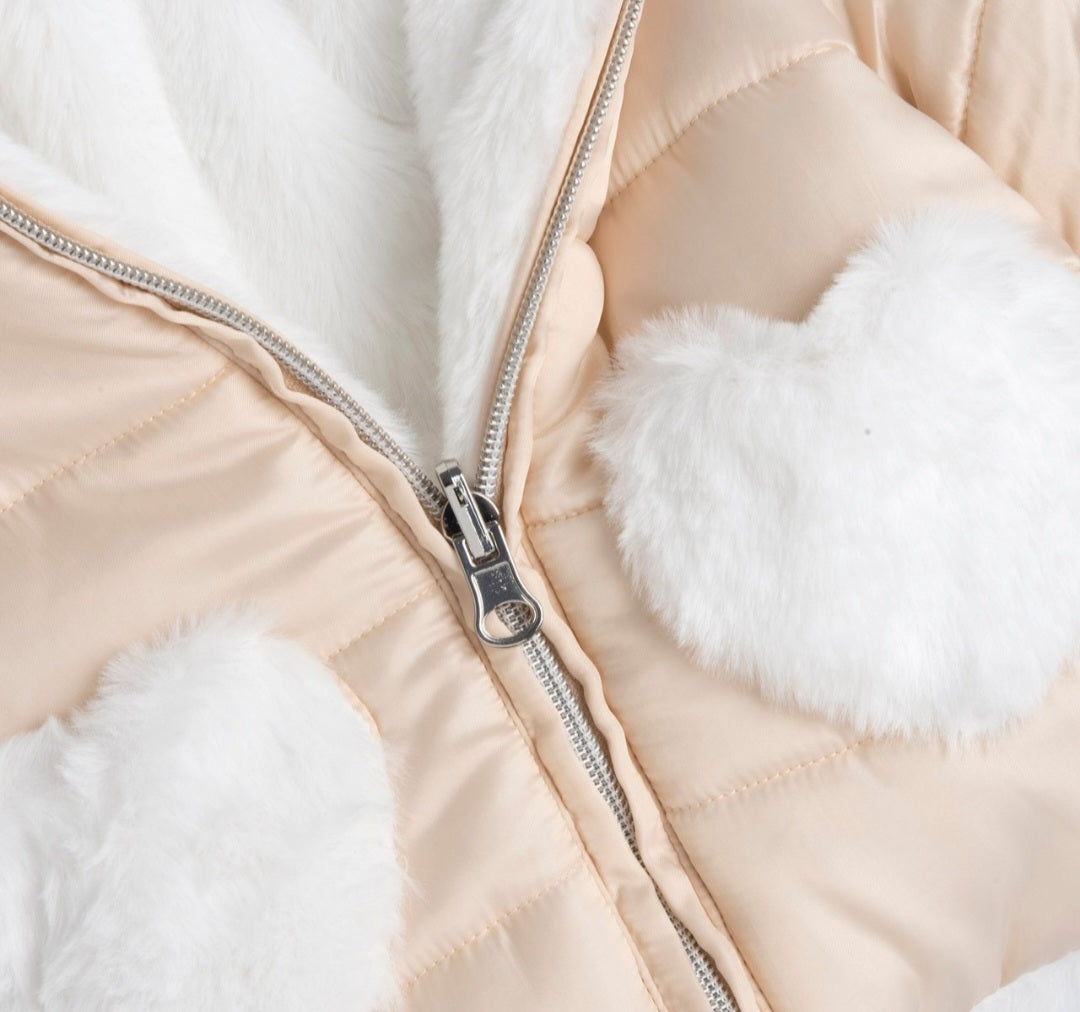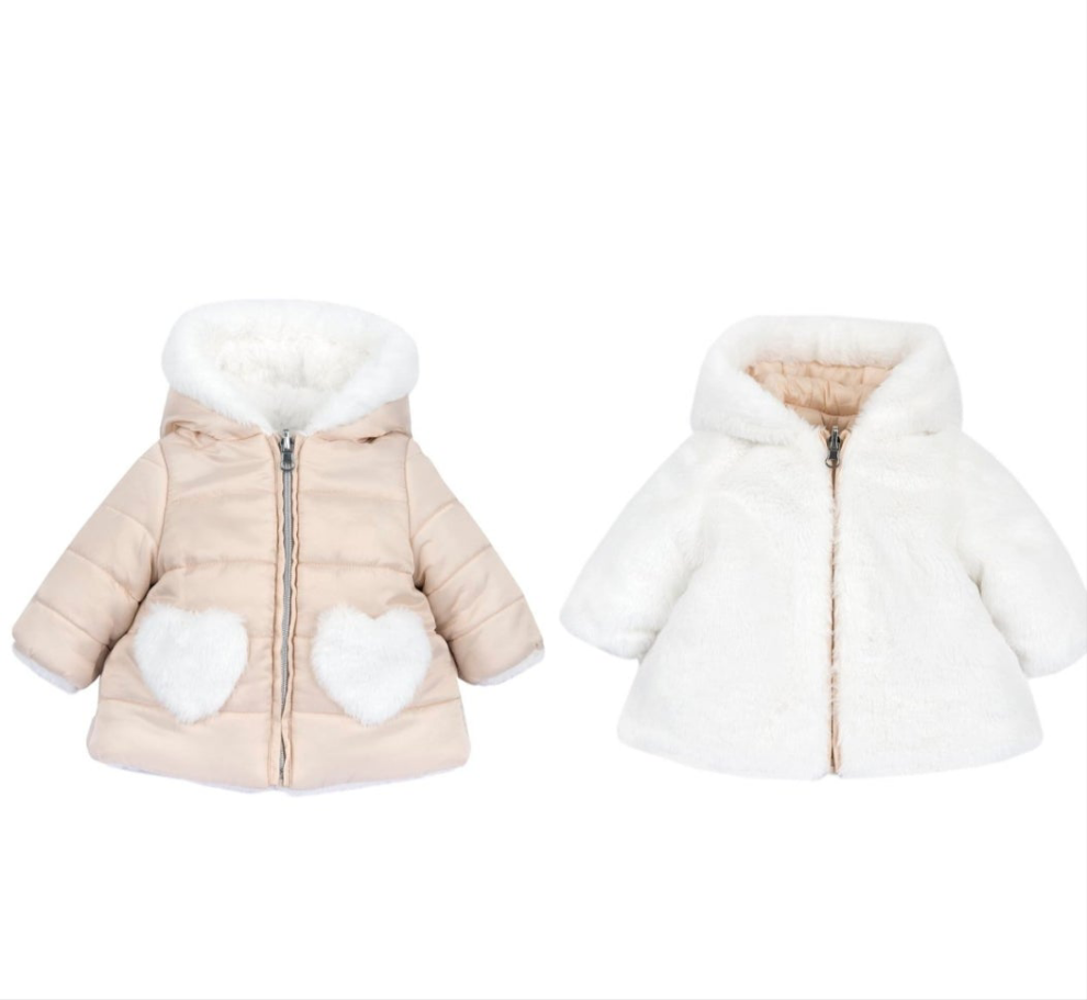 Cappottino per bambina reversibile con chiusura con zip cappuccio e dettagli cuoricini in pelliccia la parte anteriore