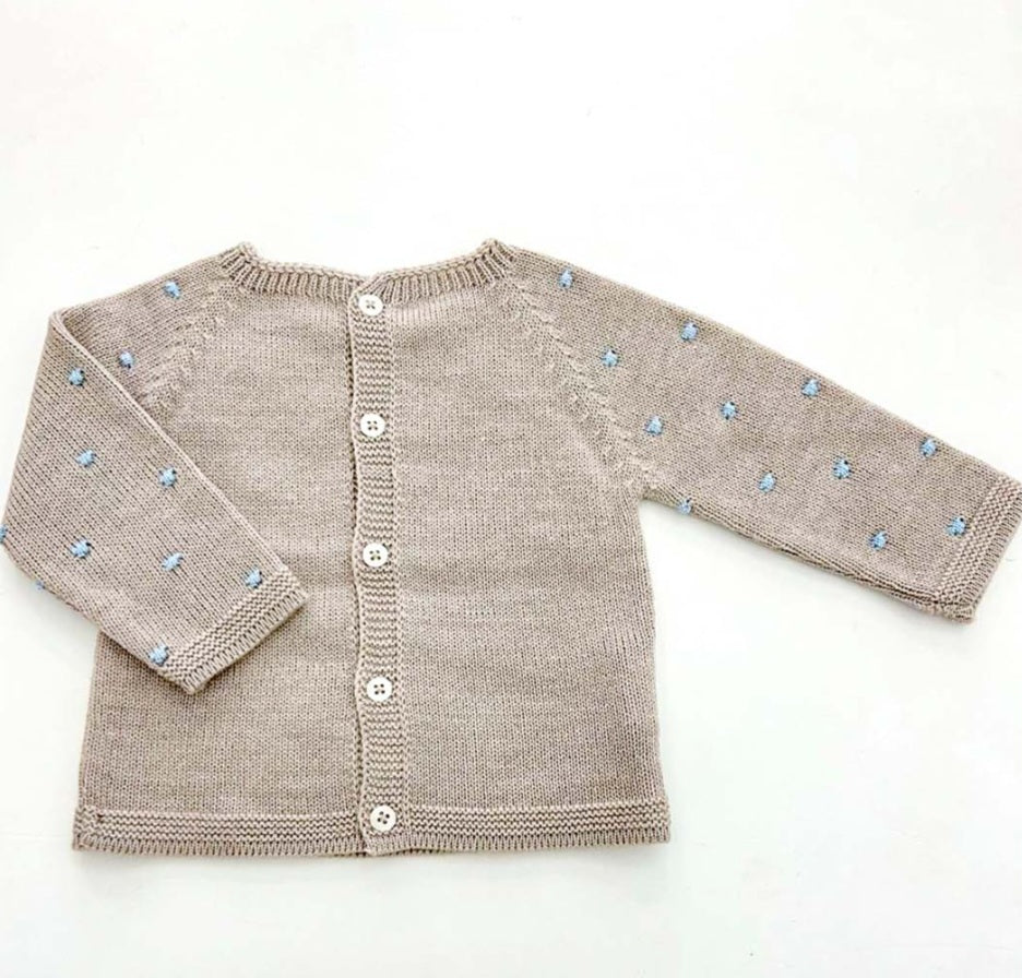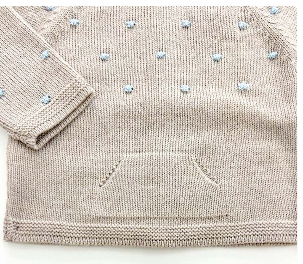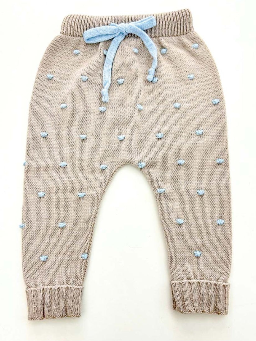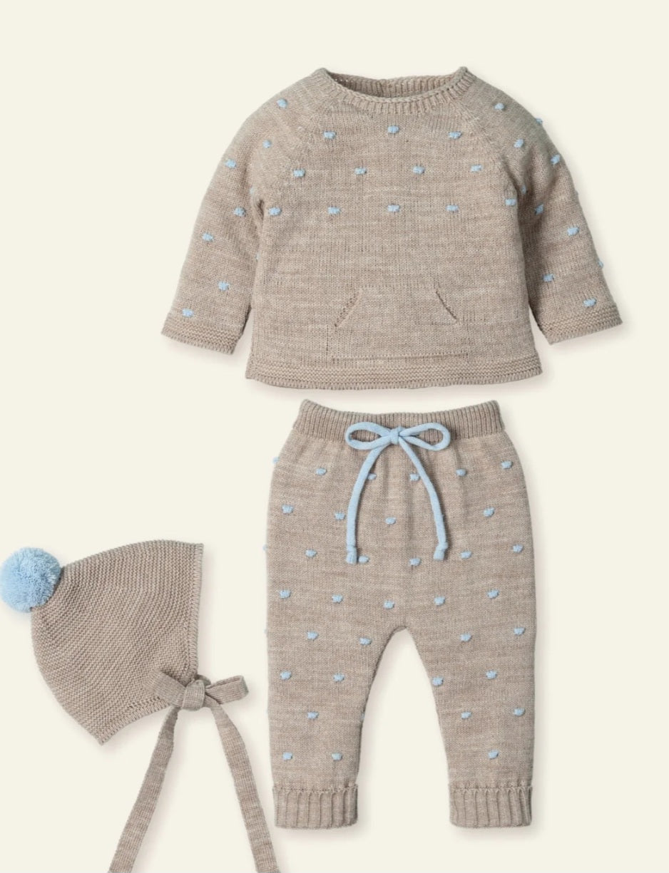 Completo misto lana per neonato tre pezzi colore beige con dettagli celesti compreso di maglia, pantalone,cappellino