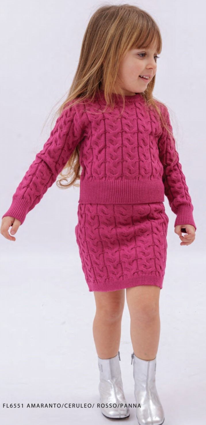Completo per bambina in lana colore amaranto gonnellina e maglia con lavorazione treccie