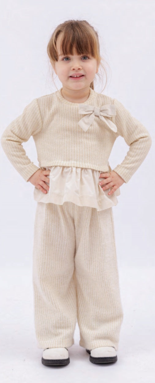 Completo per bambina in lana panna con dettagli taffeta fiocco e volant e righe in filo lurex oro