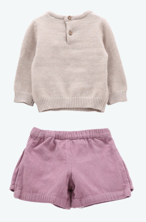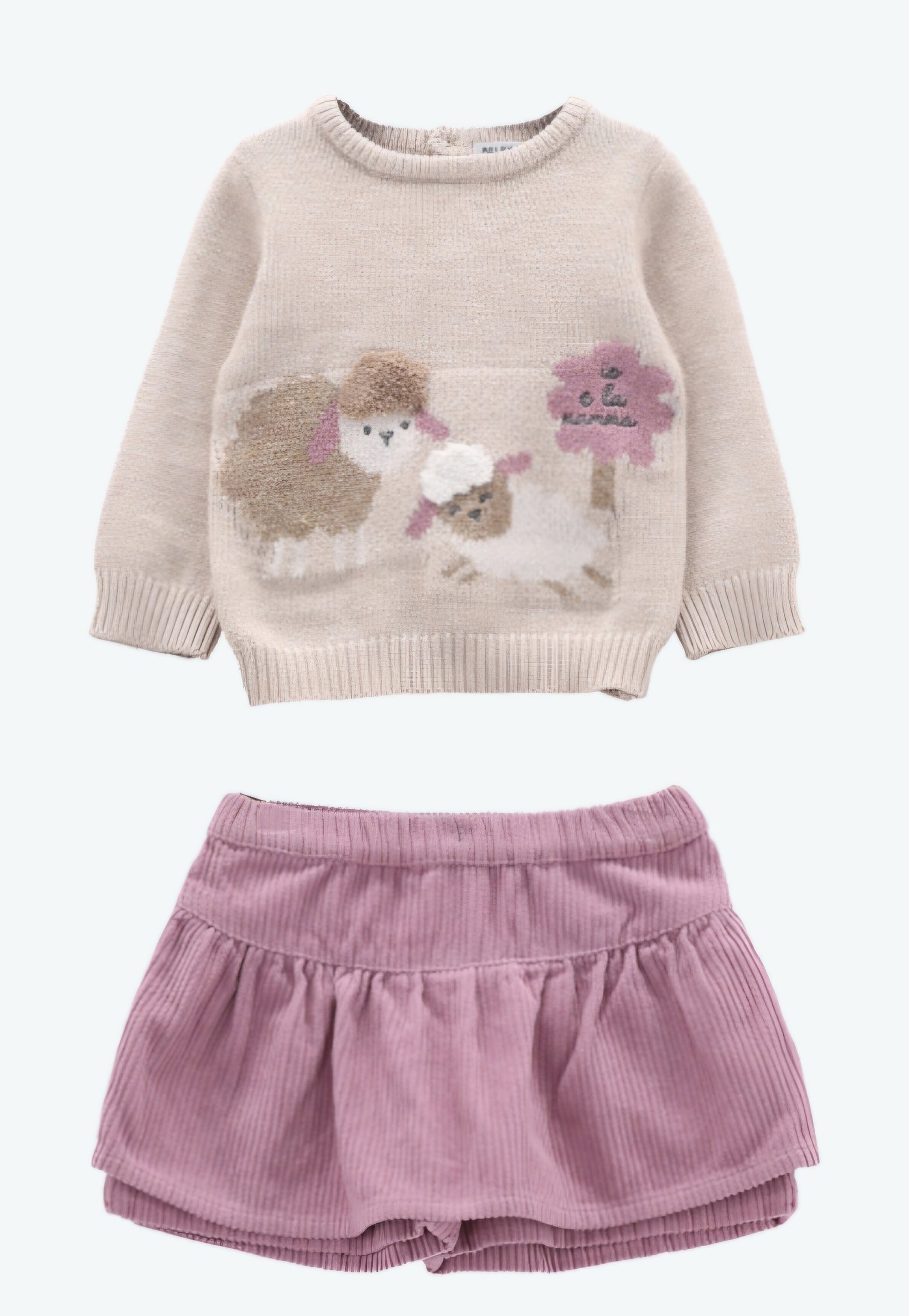 Completo per neonata composto da maglia in tricot e da una gonnellina a balze in velluto a costine. La tenera decorazione frontale della maglia riprende i toni della gonna in tinta unita. Lavorazione in costina sul collo,polsini e fondo maglia, apertura con bottoncino sul retro