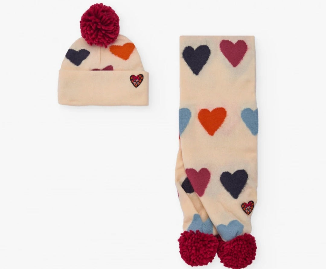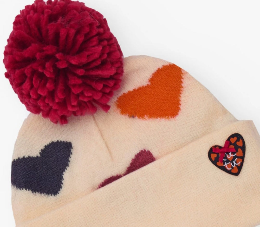 Completo per bambina sciarpa e cappuccio il lana ,colore beige chiaro con dettagli cuoricini e pompon