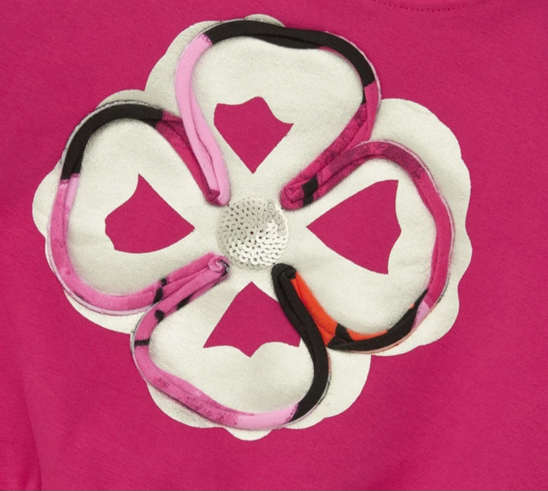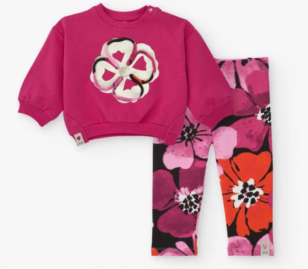 Completo per bambina, felpa di colore fucsia con un grande fiore a rilievo con pailets e leggings a fiori