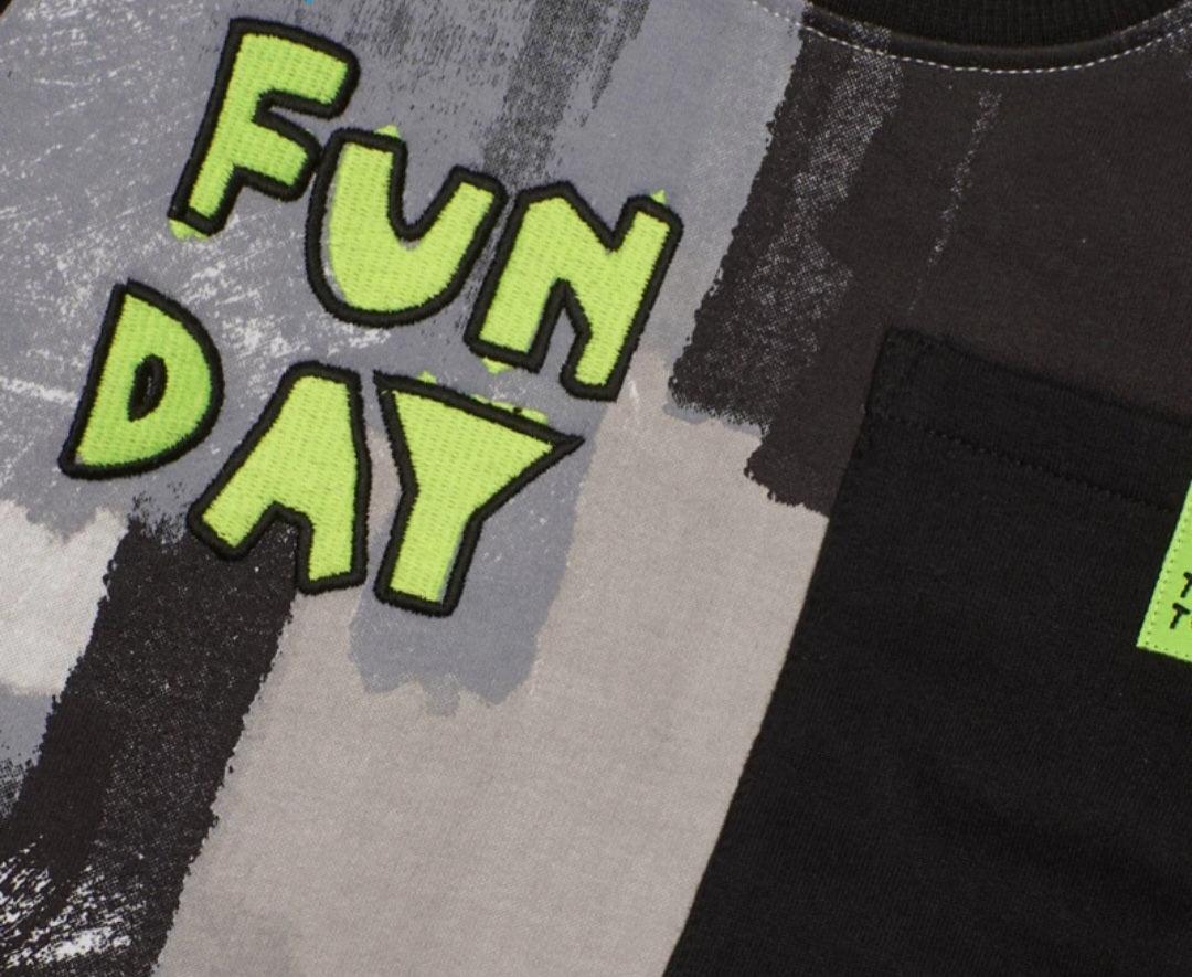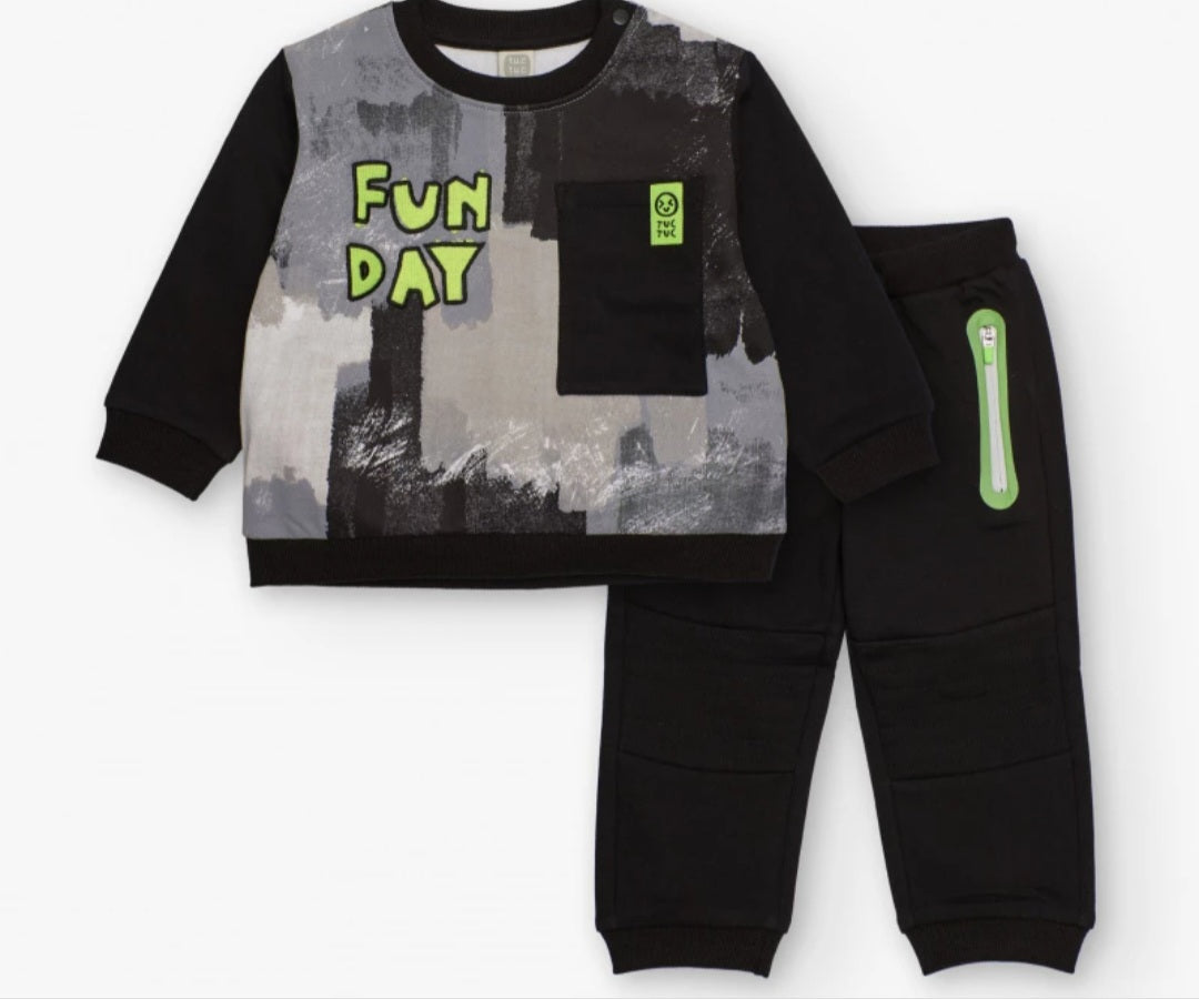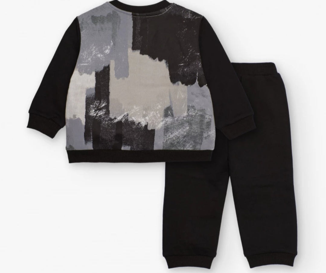 Completo felpa e pantalone per bambino in nero con stampa effetto pennellate grigie e dettagli verdi fluo