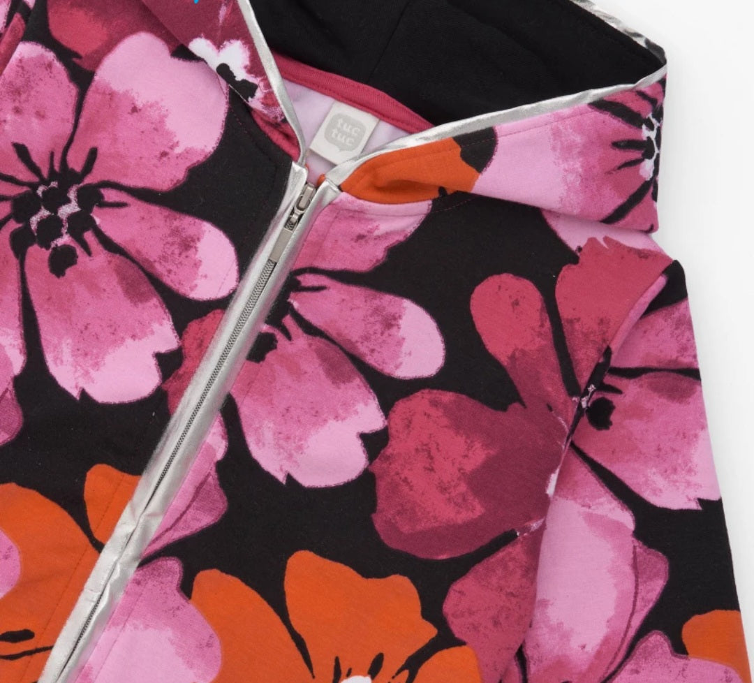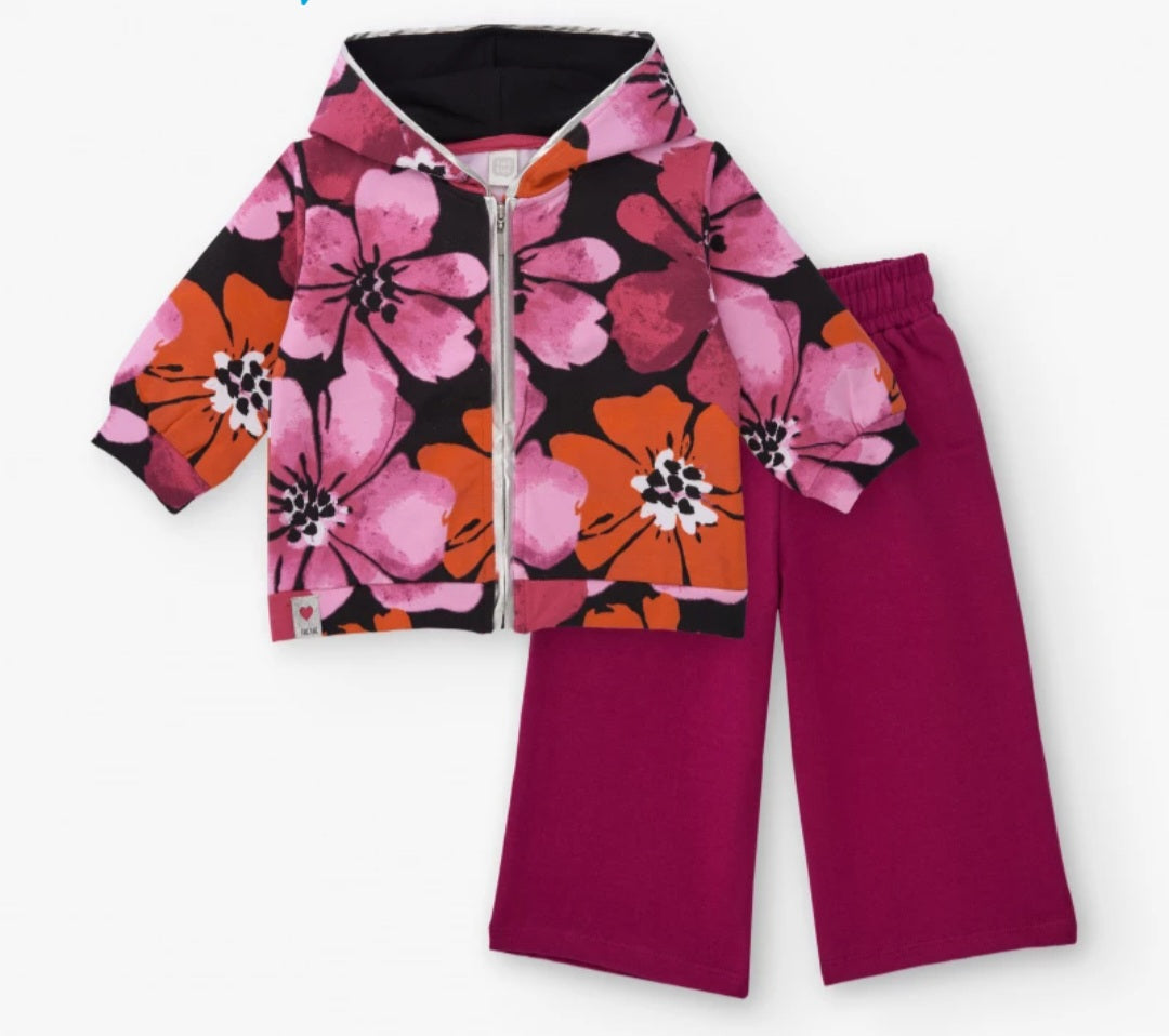 Completo per bambina composto da felpa a fiori con zip e cappuccio. Pantaloni a palazzo