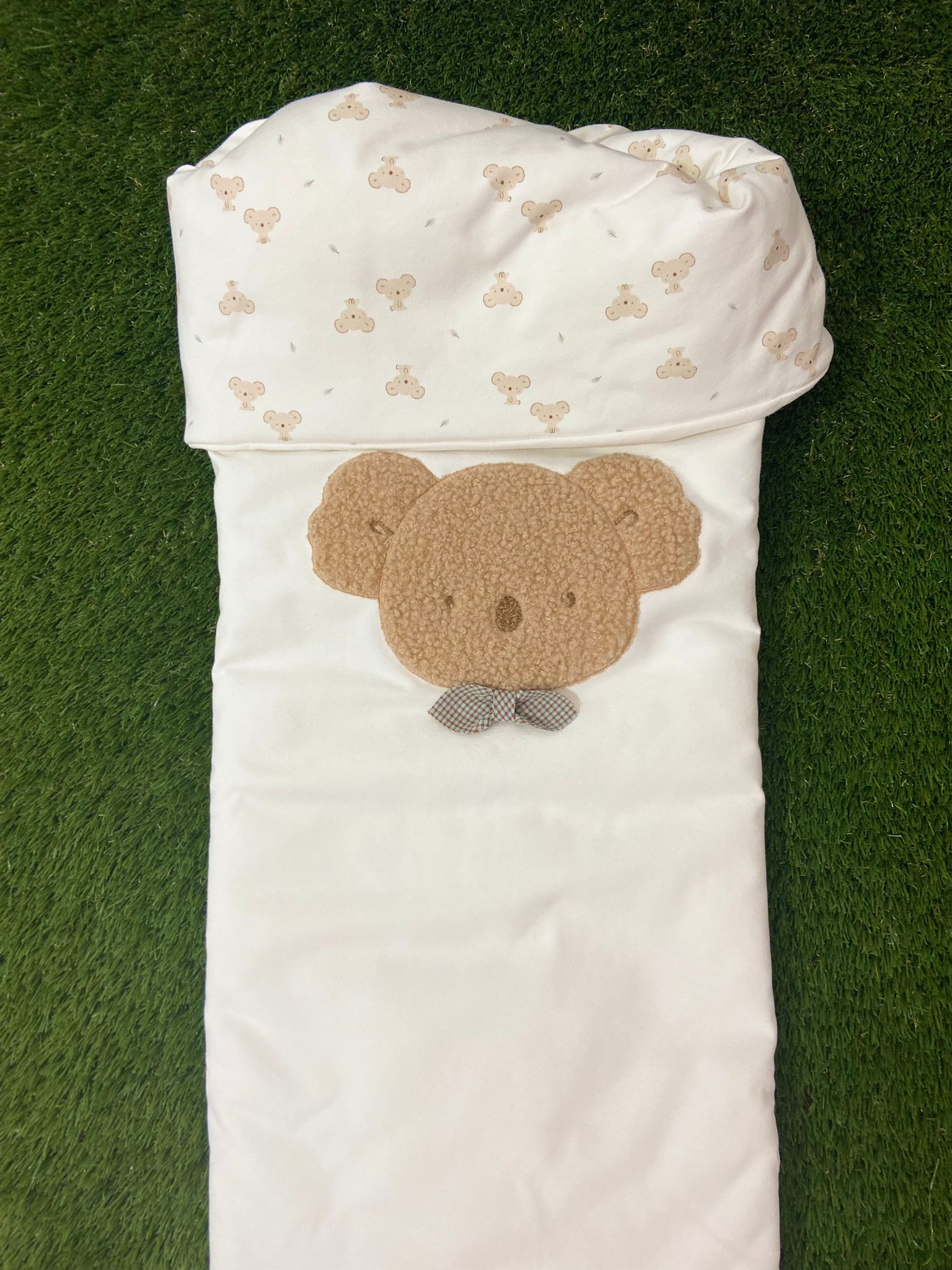 Copertina per carrozzina (navicella)in ciniglia bianca con dettaglio orsetto teddy con fiocco a quadri verde.