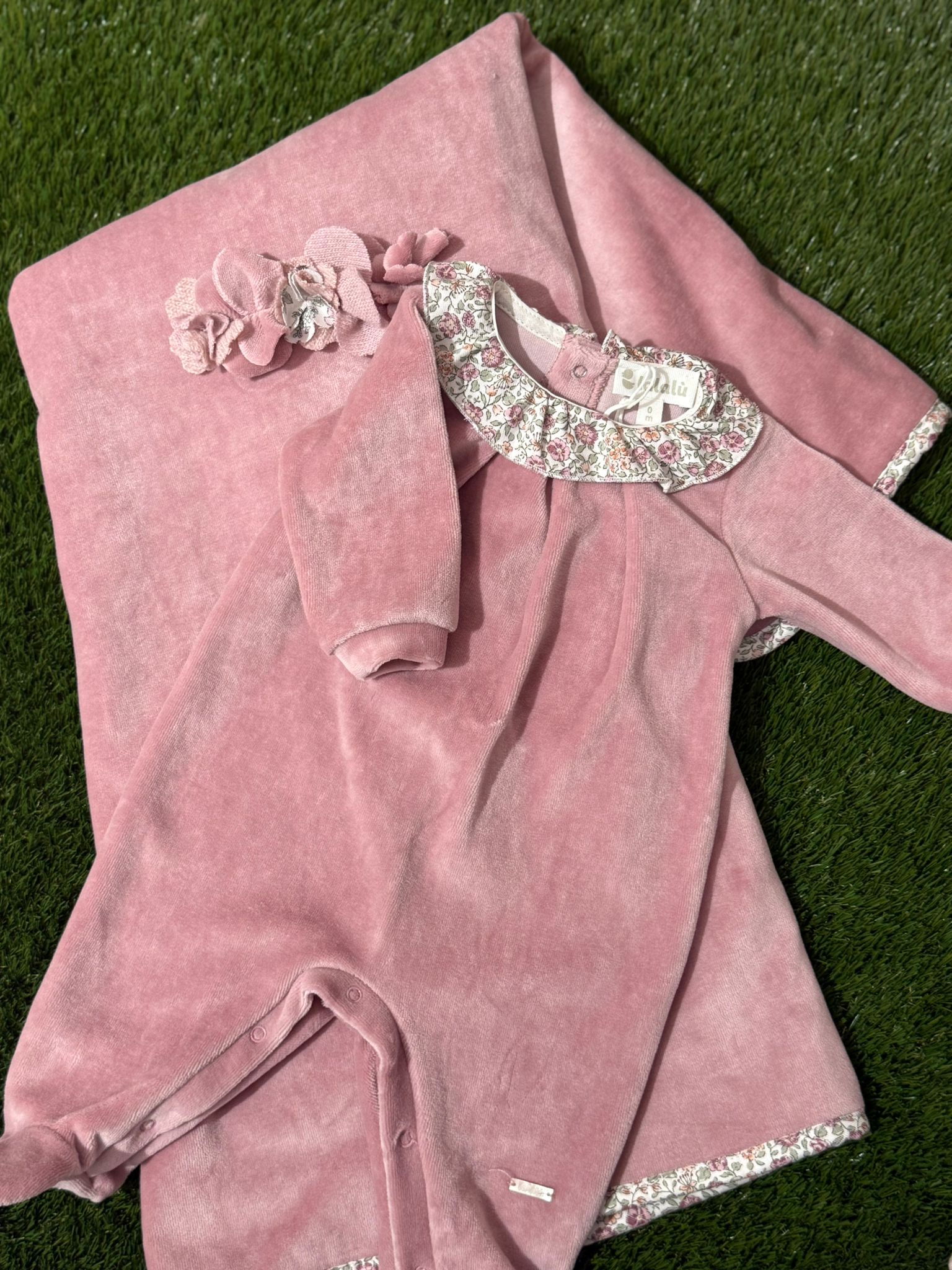 Cordinato in ciniglia per neonata copertina colore rosa antico con dettaglio fiori centrali e bordura fiorita. Tutina con colletto con Rouches fiorite