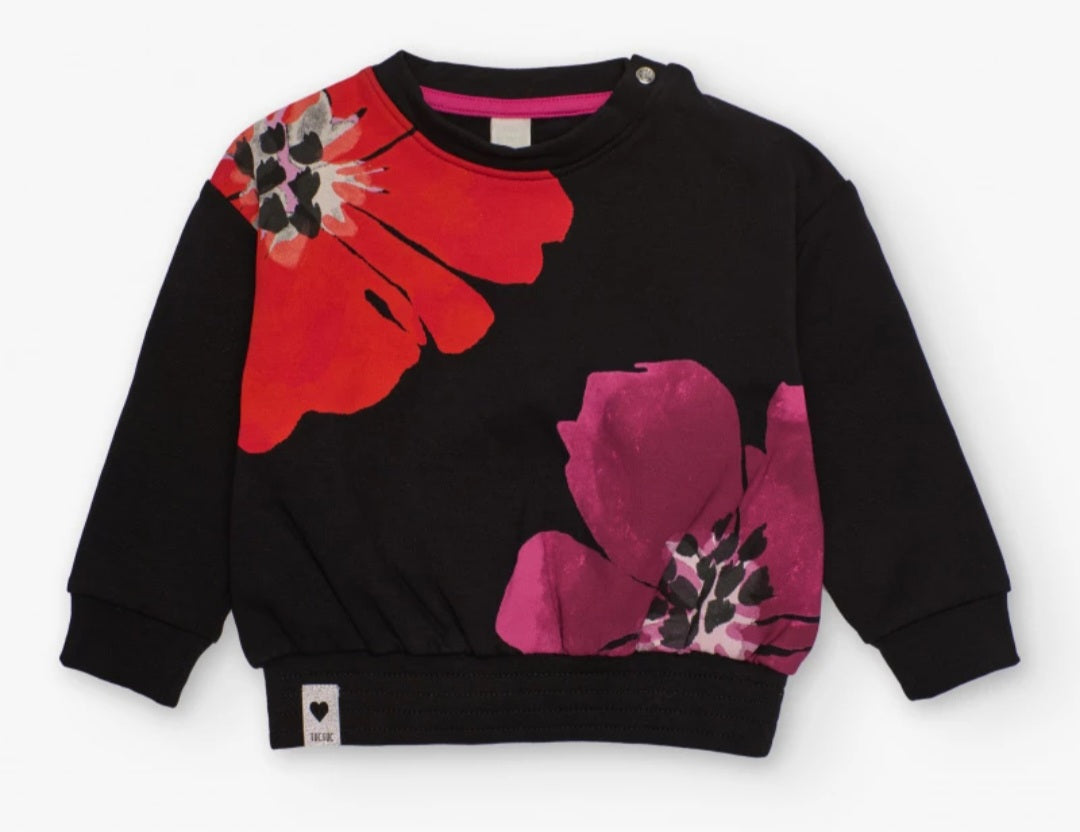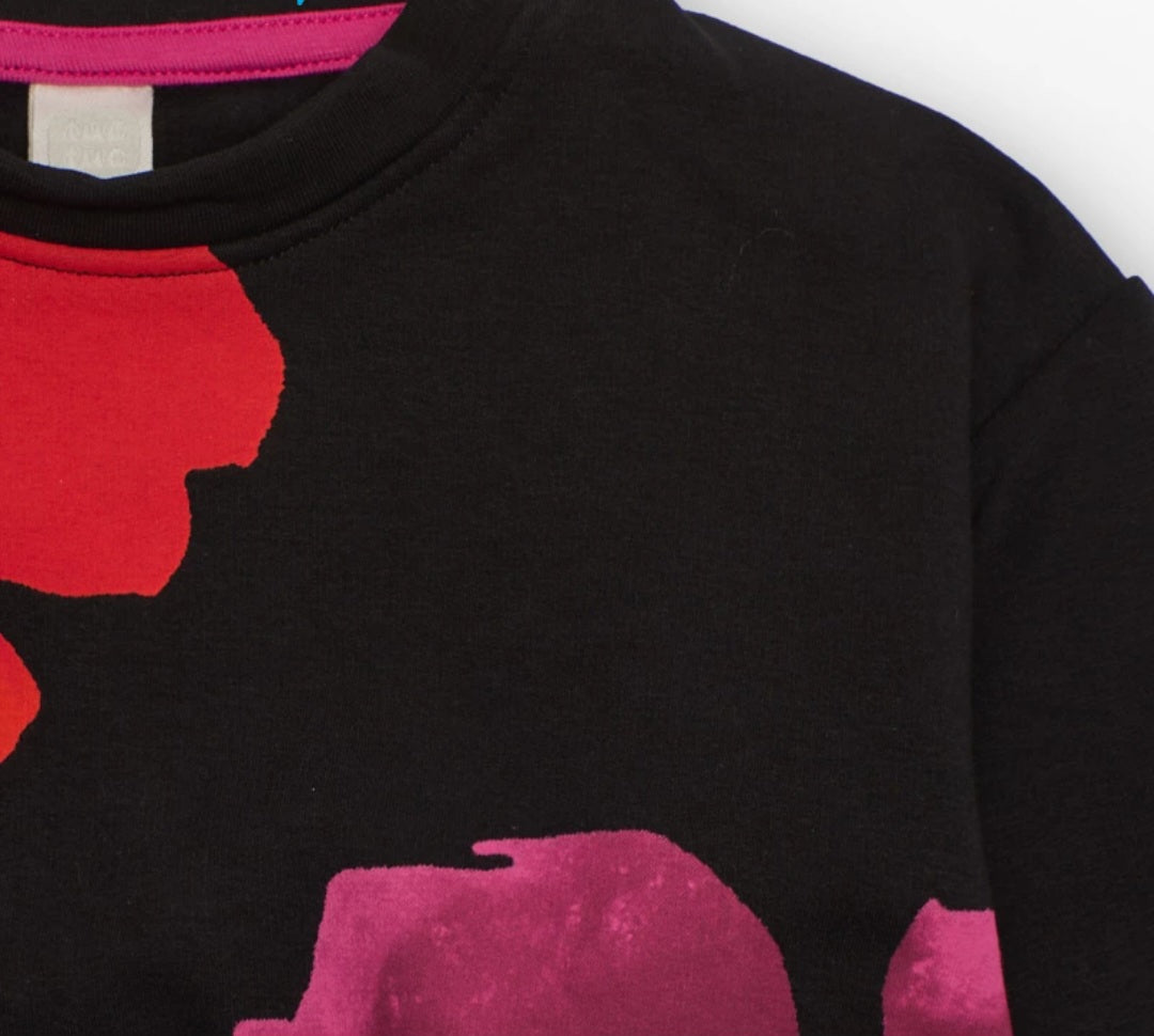 Felpa per bambina di colore nero con stampa floreale rossa e fucsia