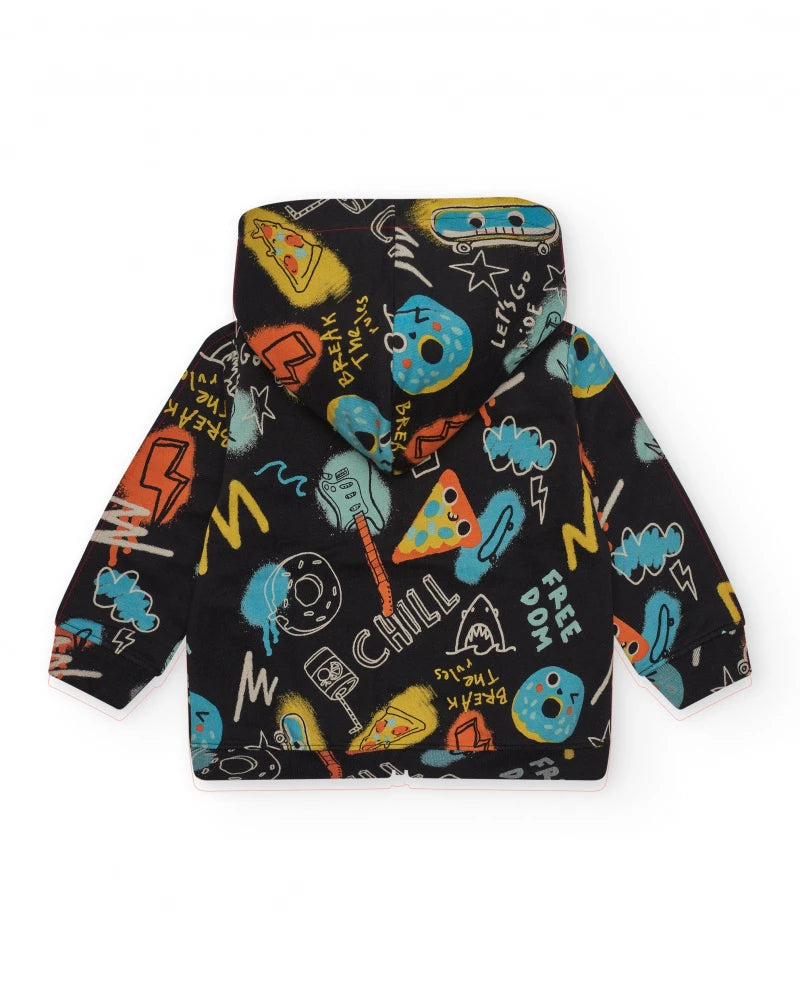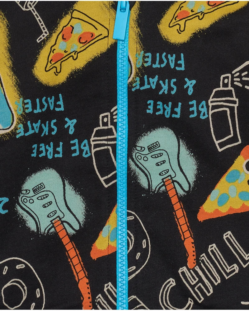 Giacca in felpa per bambino nera: Con stampa multicolore che include pizze, chitarre e frasi come "Chill" e "Free Dom". Ha cappuccio, chiusura a cerniera frontale e finiture elastiche. Collezione First Have Fun.