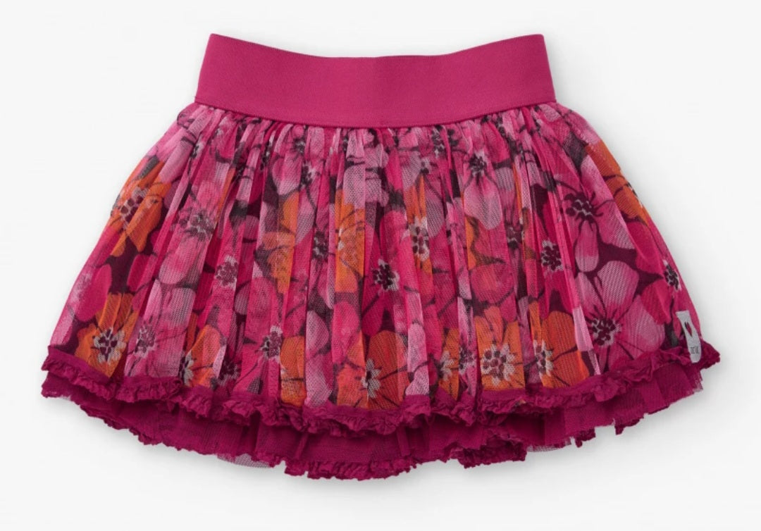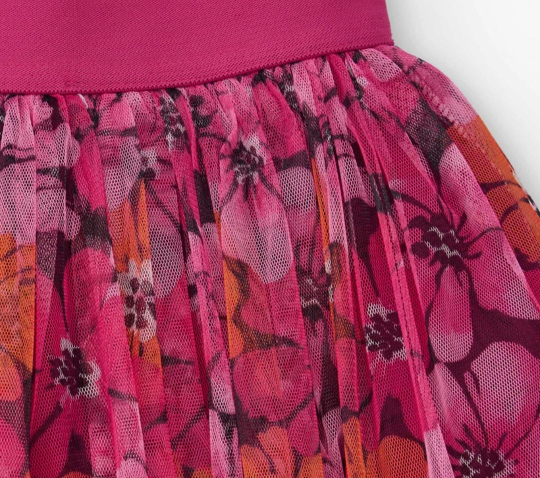 Gonna per bambina in tulle plisse fucsia con stampa floreale ed elastico in vita