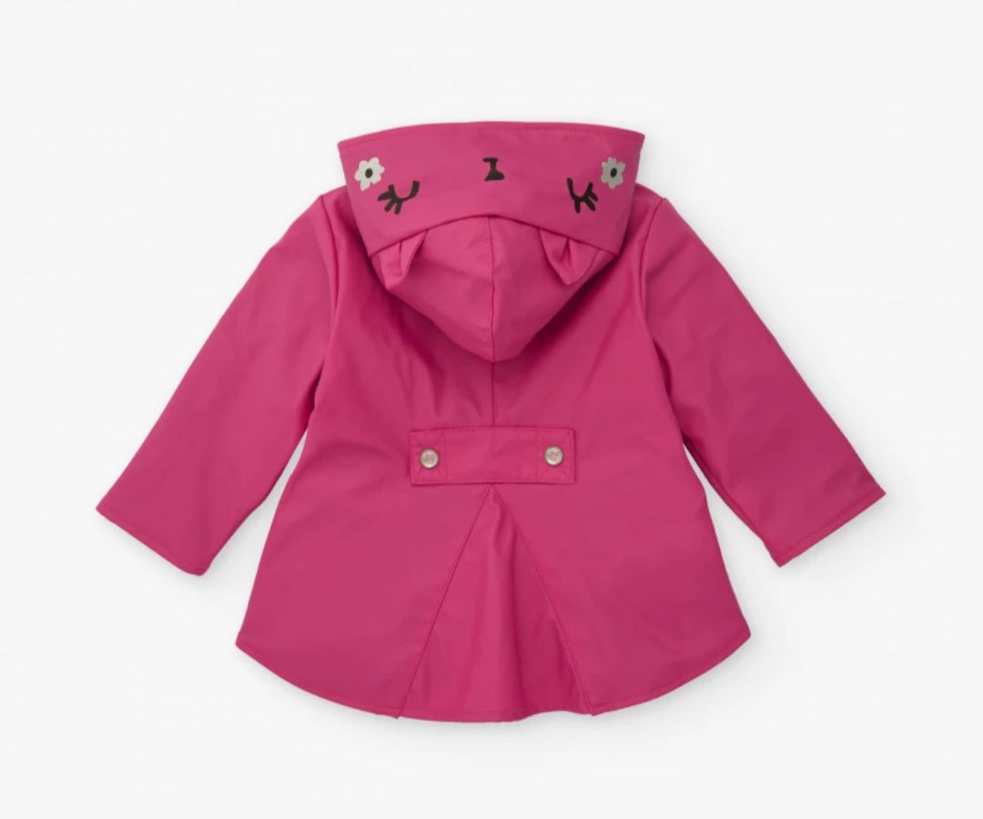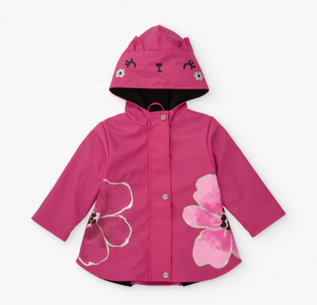 Impermeabile imbottito da bambina di colore fucsia con tenera decorazione sul cappuccio e grandi fiori entrambi i lati della giacca