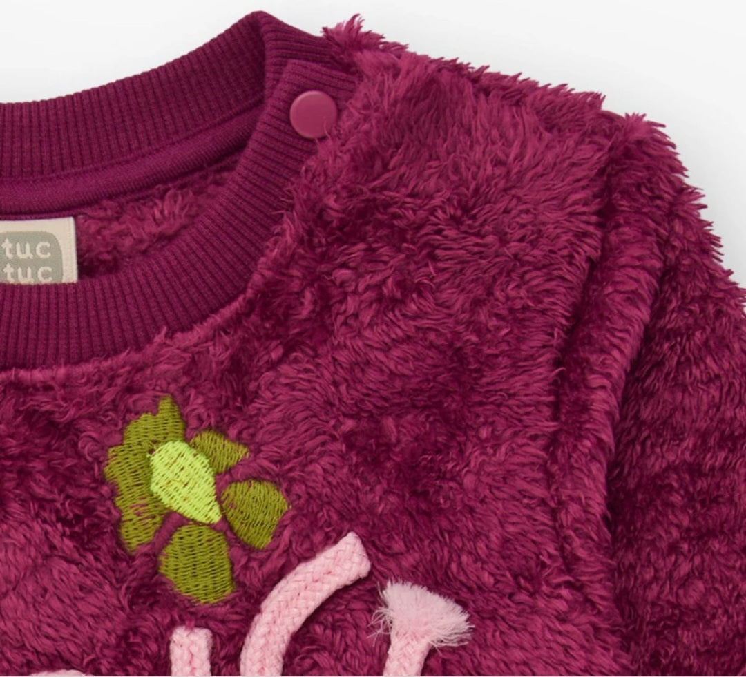 Felpa in tessuto peluche per bambina di colore bordeaux, con scollo rotondo e chiusura con bottone a pressione sulla spalla. Presenta una scritta “magic” ricamata in rilievo e piccoli motivi floreali. Un capo comodo e caldo, perfetto per le giornate fredde.