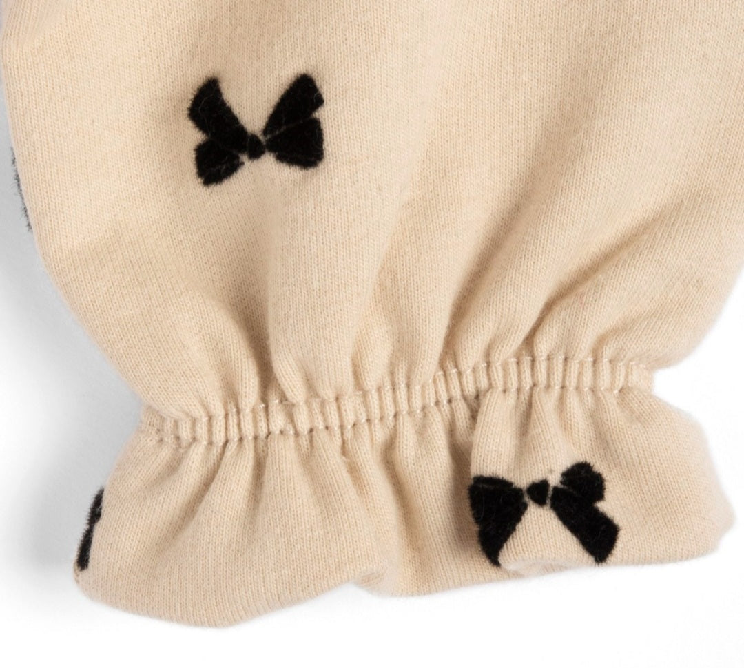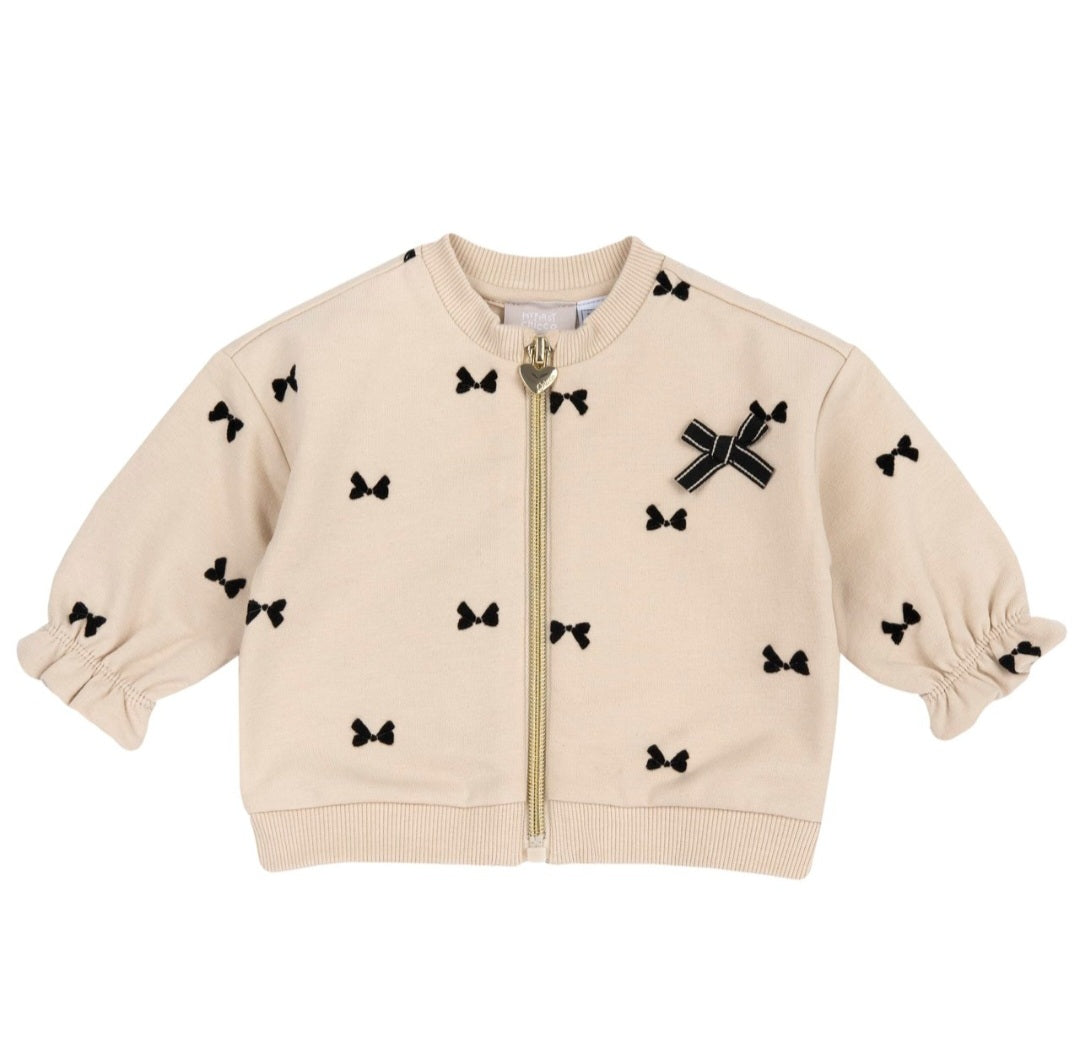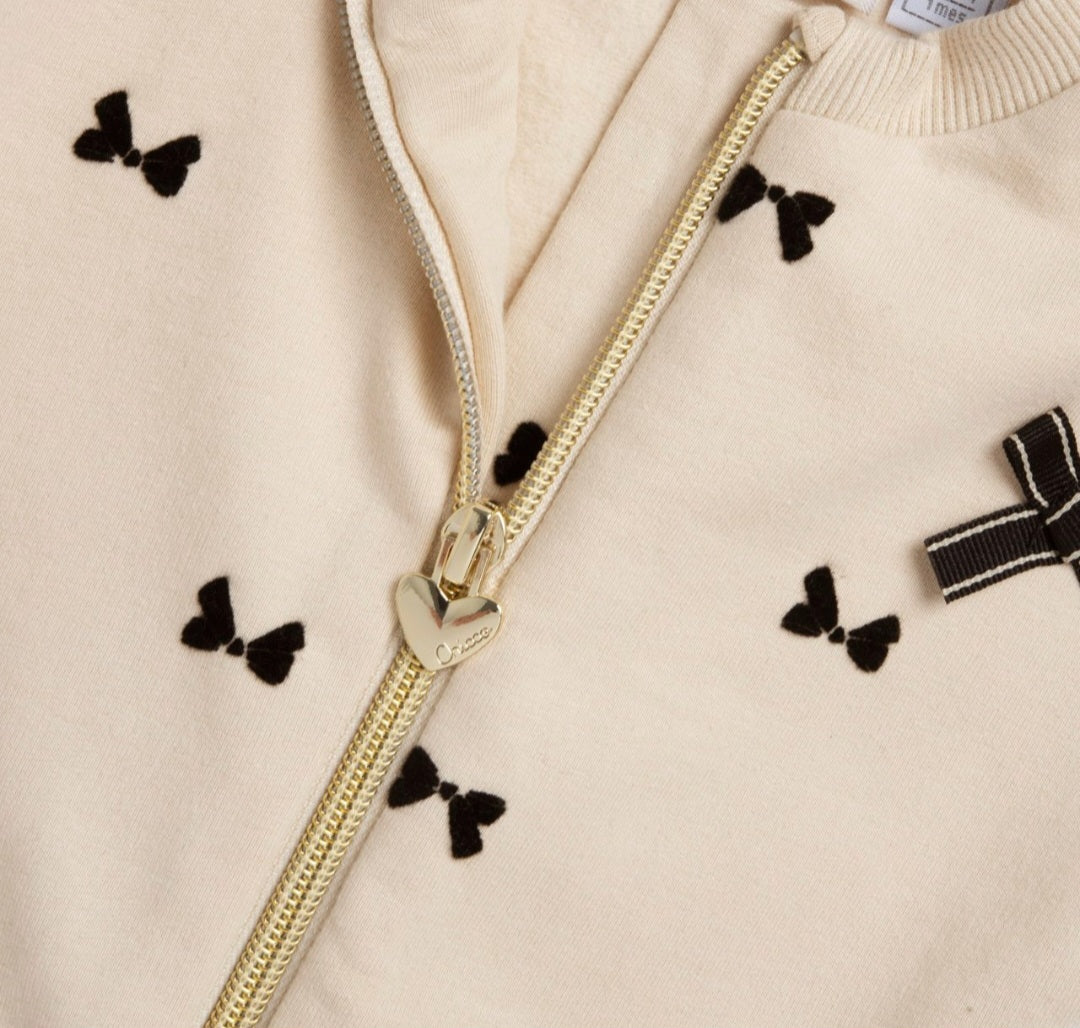 Tutina per bambina in felpa beige con dettagli piccoli fiocchi in velluto neri ,apertura con zip colore oro .