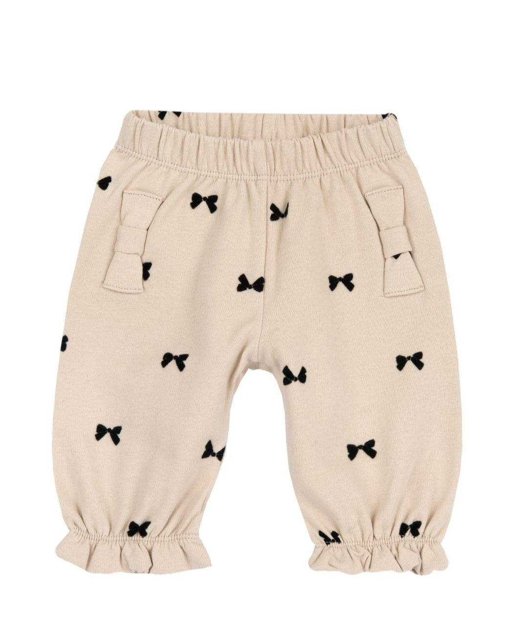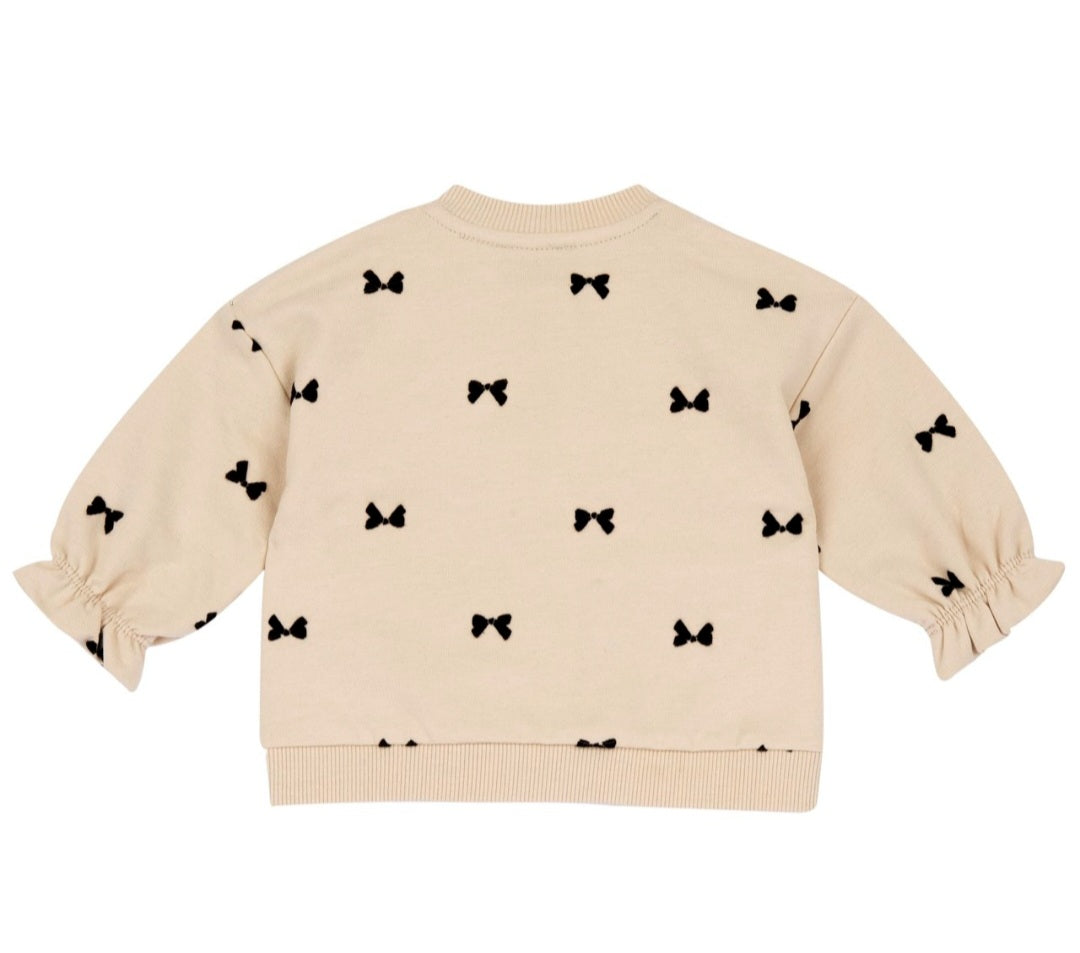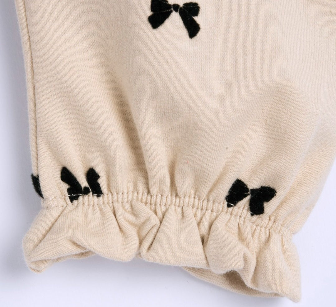 Tutina per bambina in felpa beige con dettagli piccoli fiocchi in velluto neri ,apertura con zip colore oro .