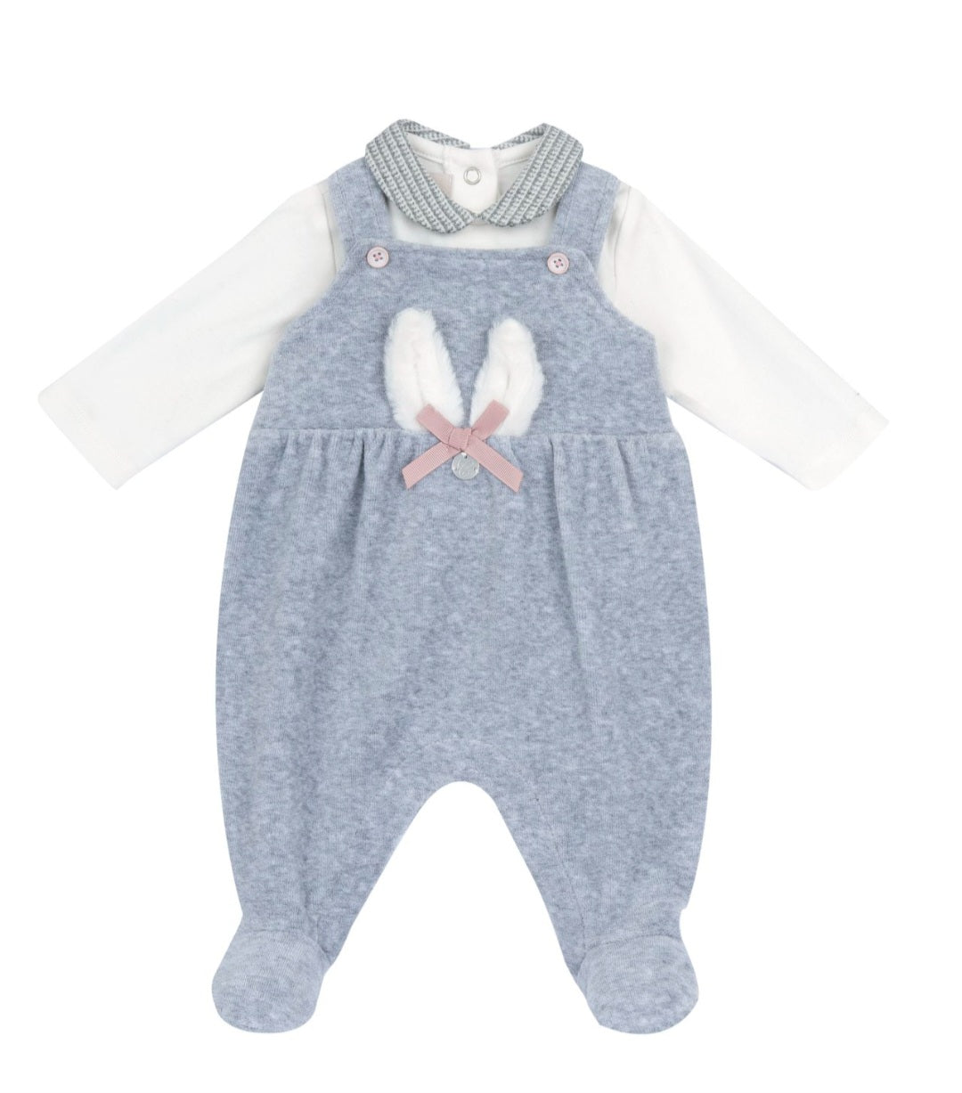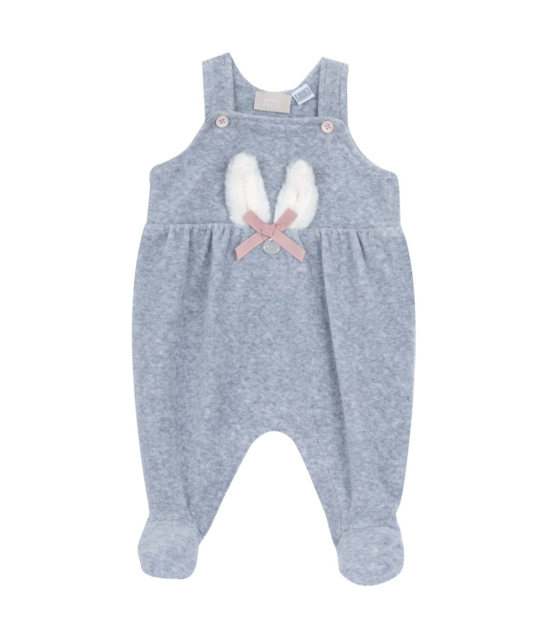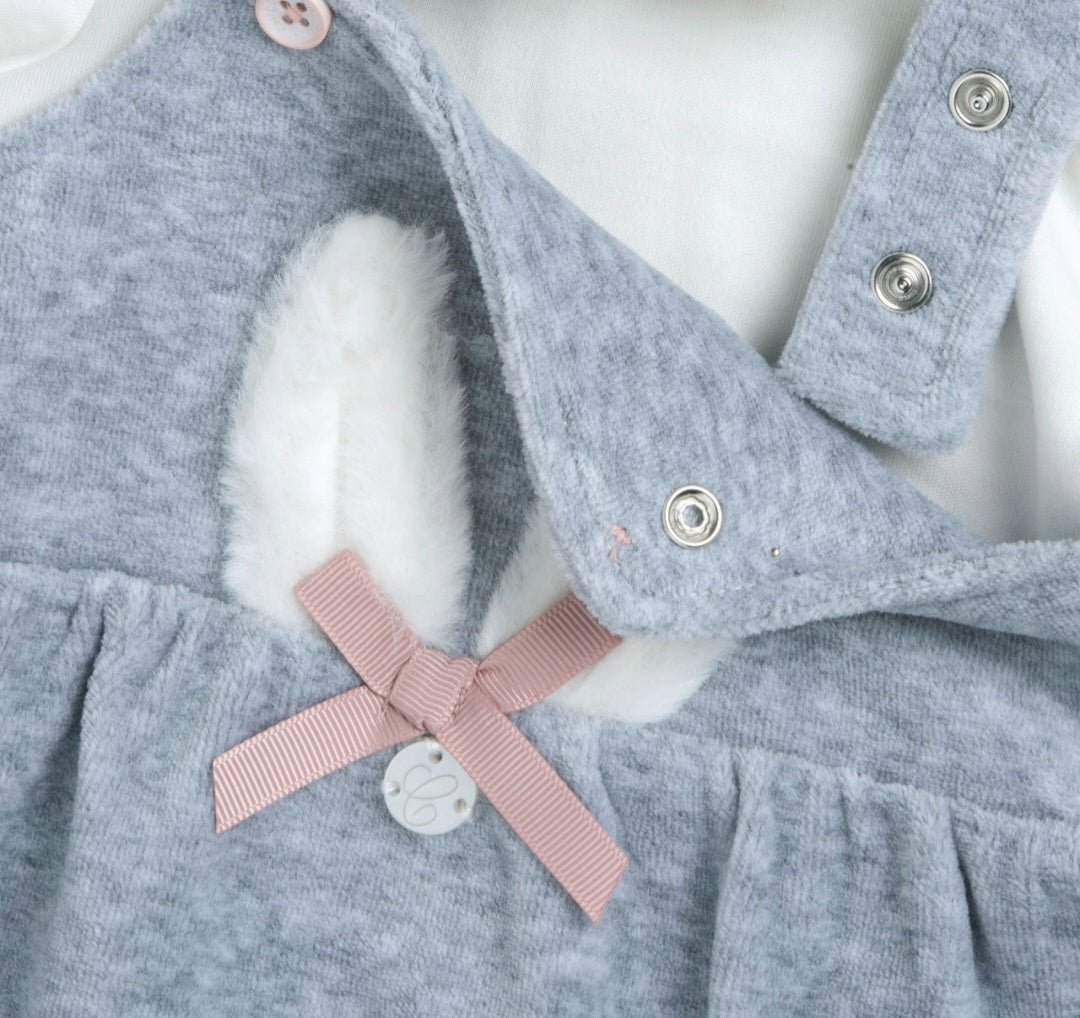 Tutina salopette in ciniglia grigio con body bianco e dettagli grigi ,la salopette con apertura interno gamba con dettaglio coniglietta in pelliccia con fiocco