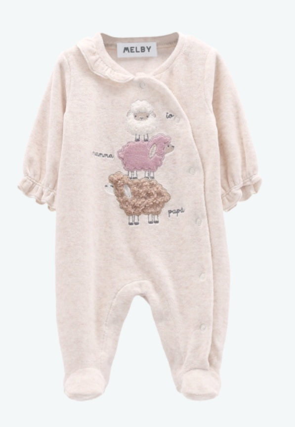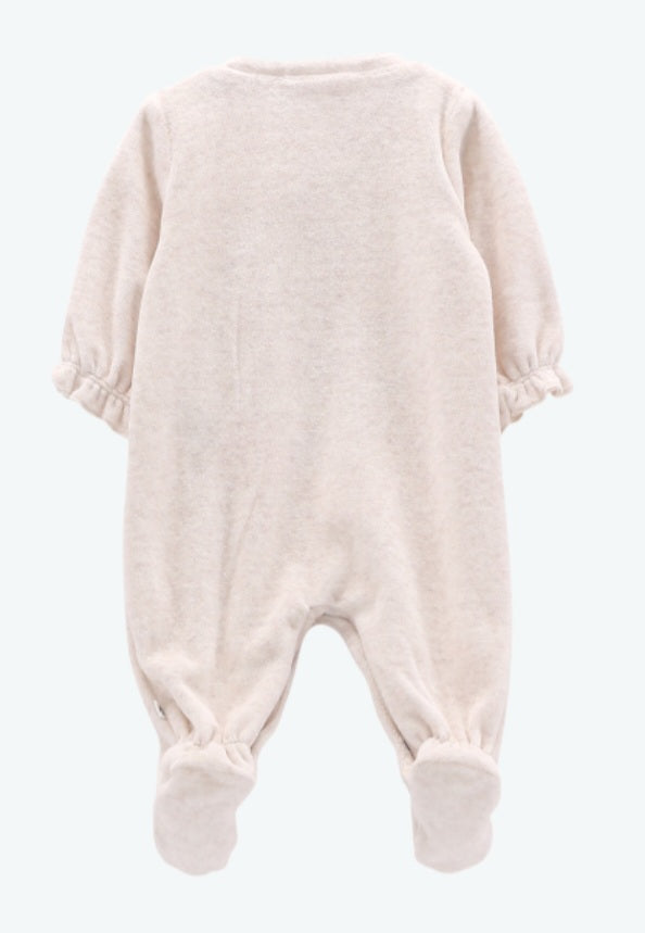 Tutina con piede in ciniglia per neonata, con vezzosa Rouches sui polsini e sul colletto tenere applicazione frontale, pratica apertura a bottoncini sul lato frontale