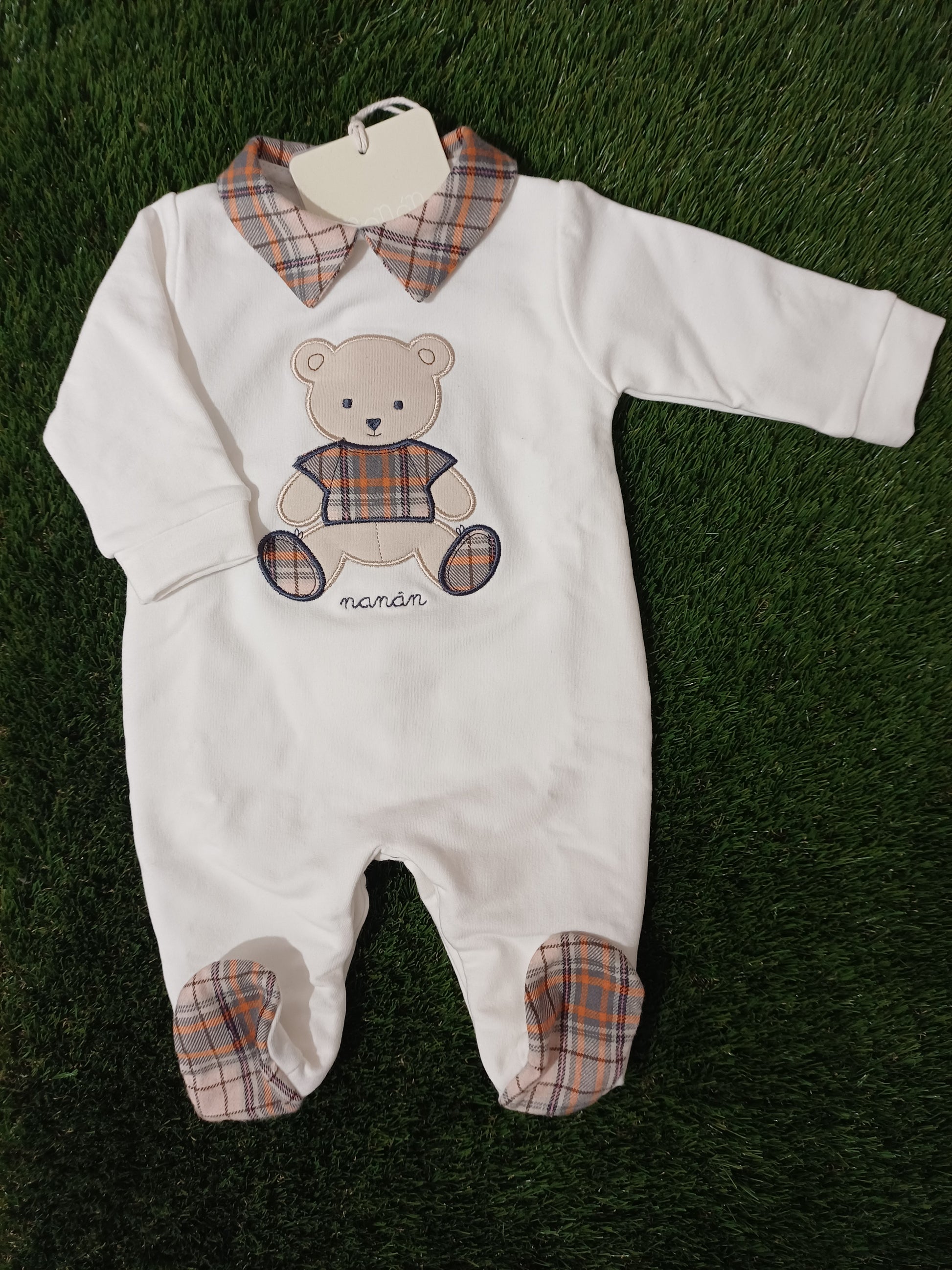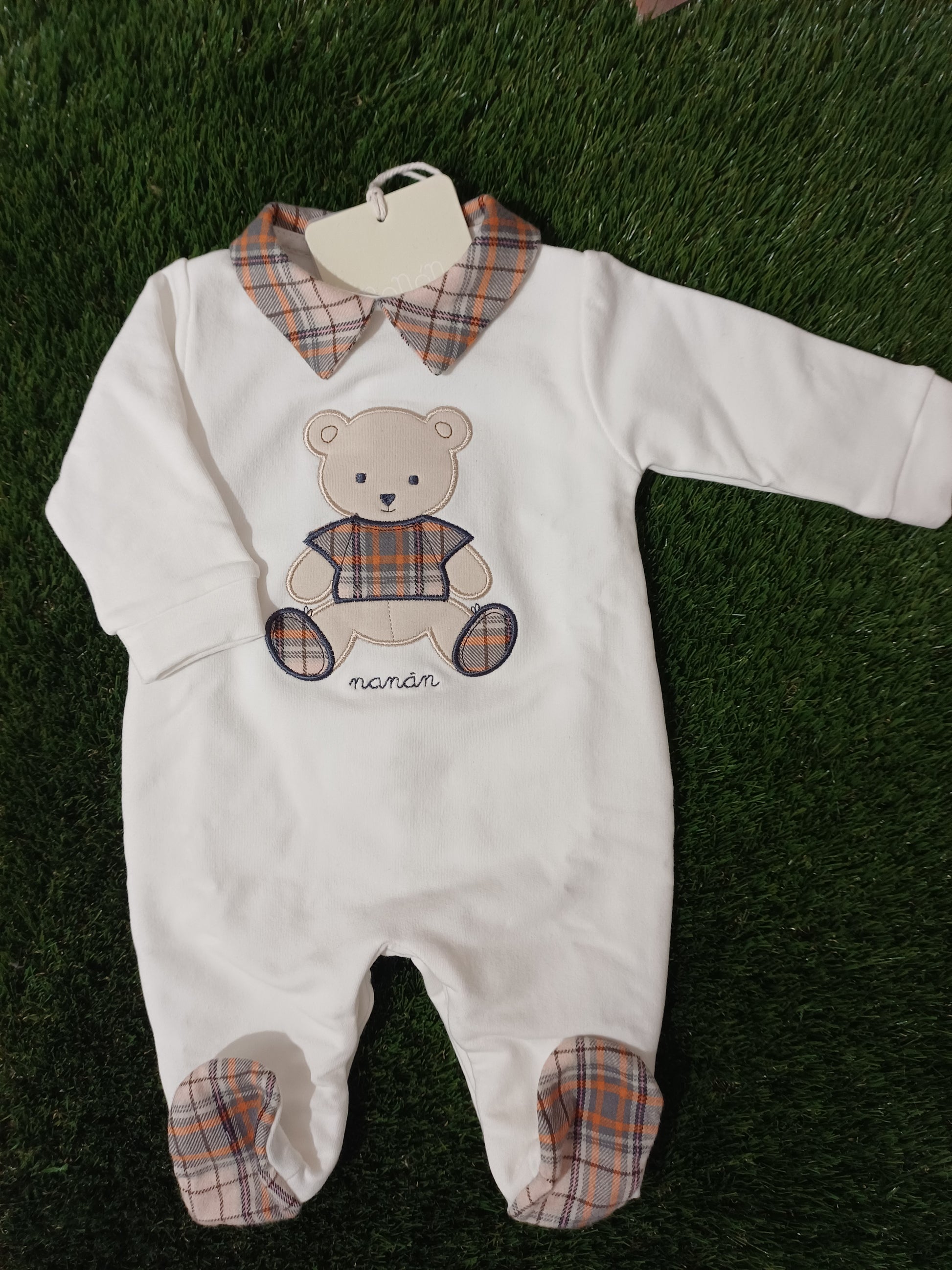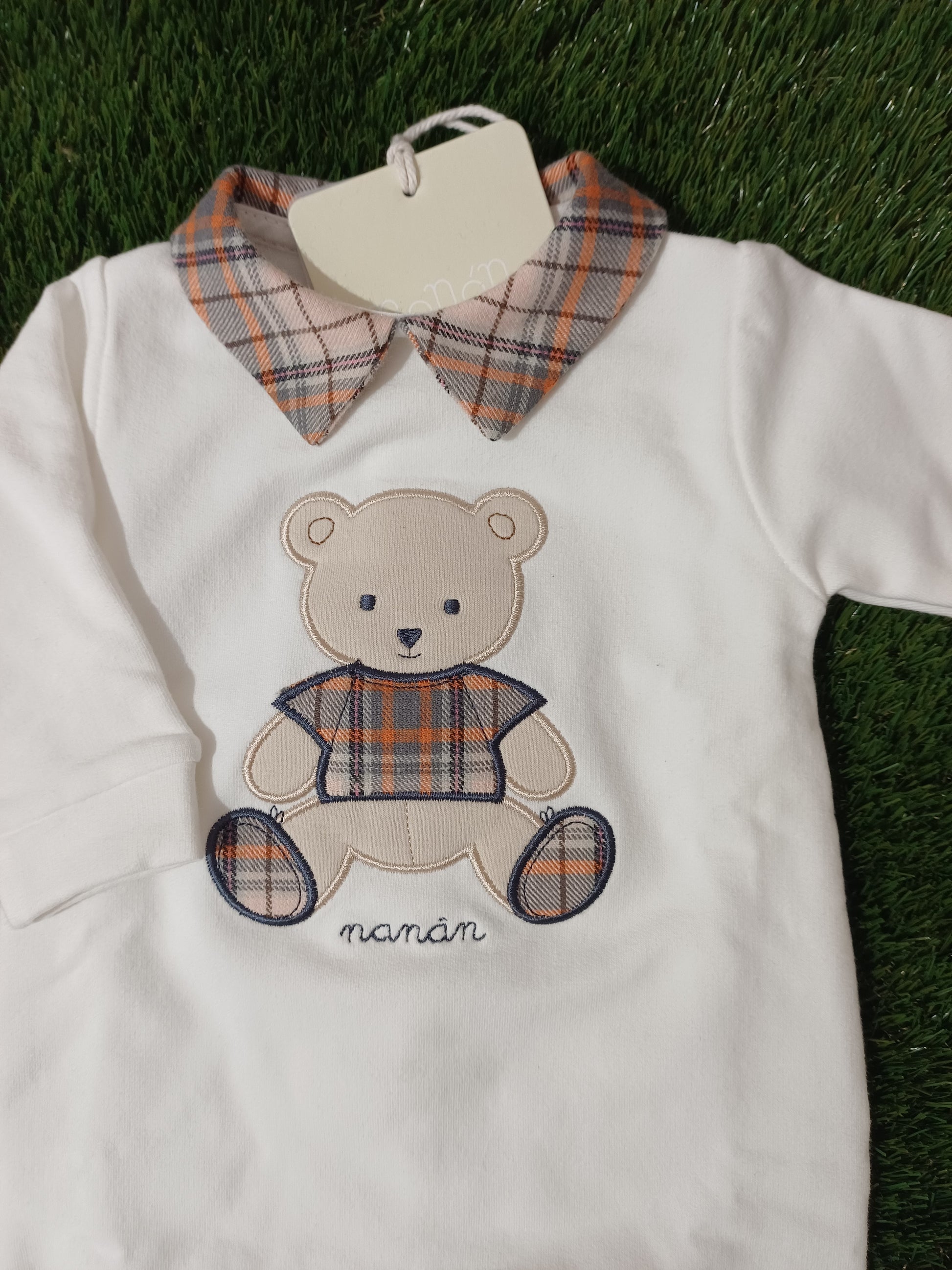 Tutina per neonato in caldo cotone panna con dettaglio scozzese tenero orsetto la parte anteriore. Chiusura con bottoni a pressione la parte posteriore della Tutina