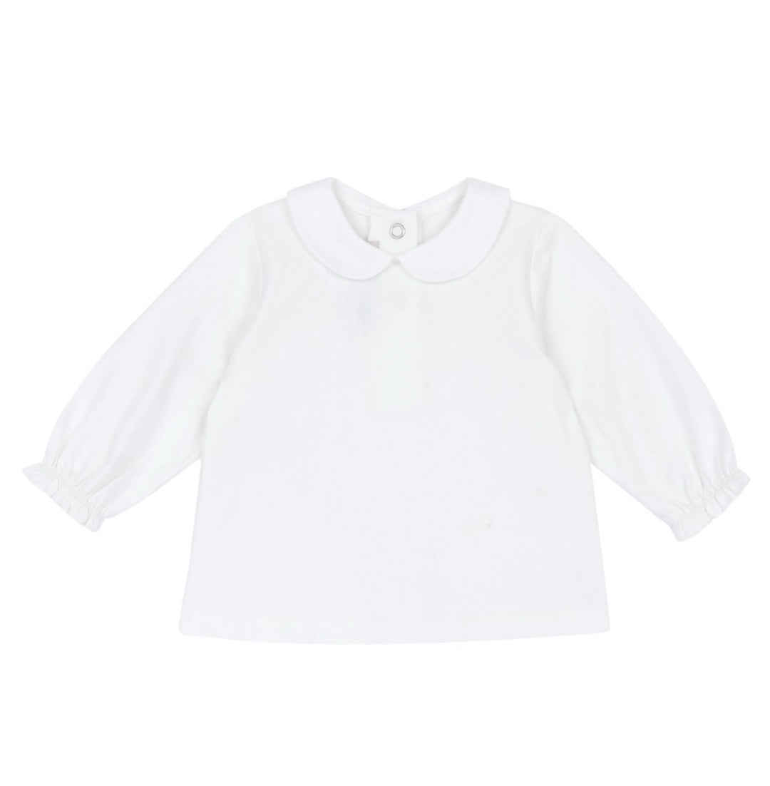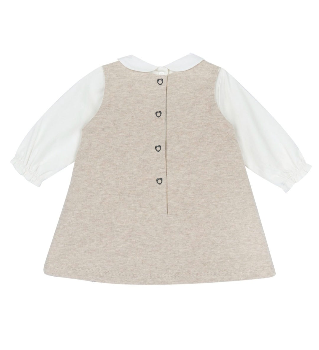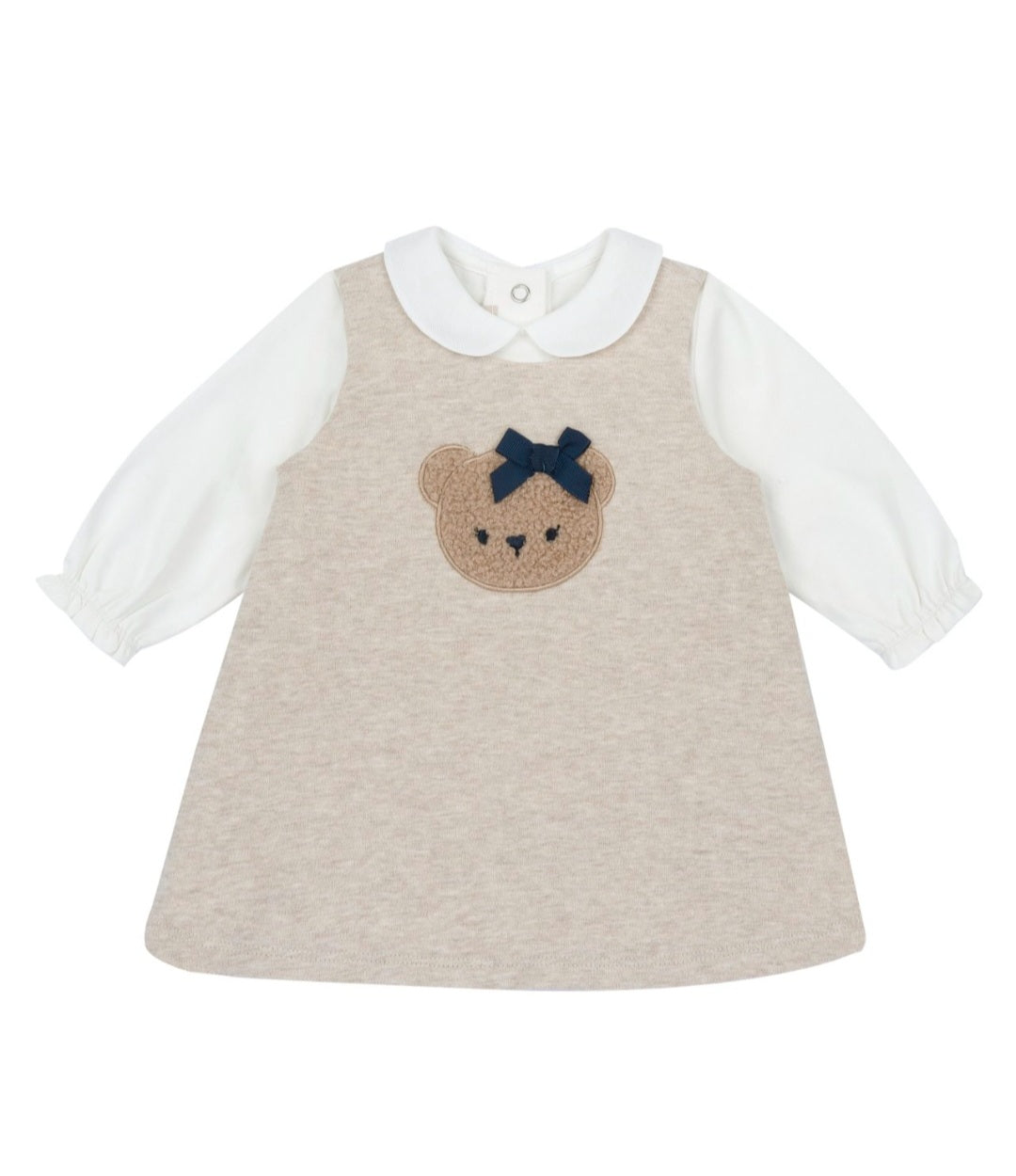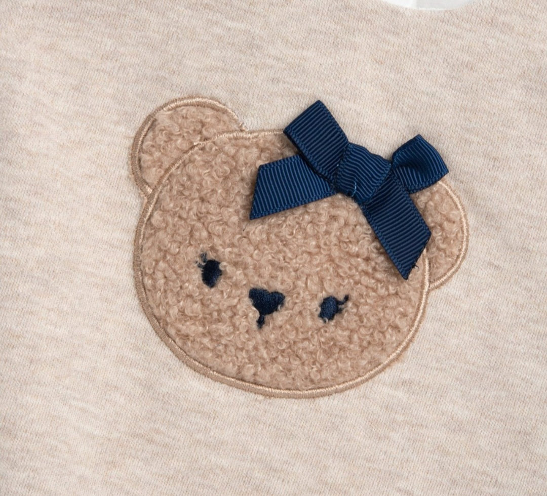 Completo camicina in caldo cotone con colletto e maniche arricciate colore panna, scamiciato beige con bottoncini a clip la parte posteriore. Tenera orsetto con fiocco blu la parte anteriore