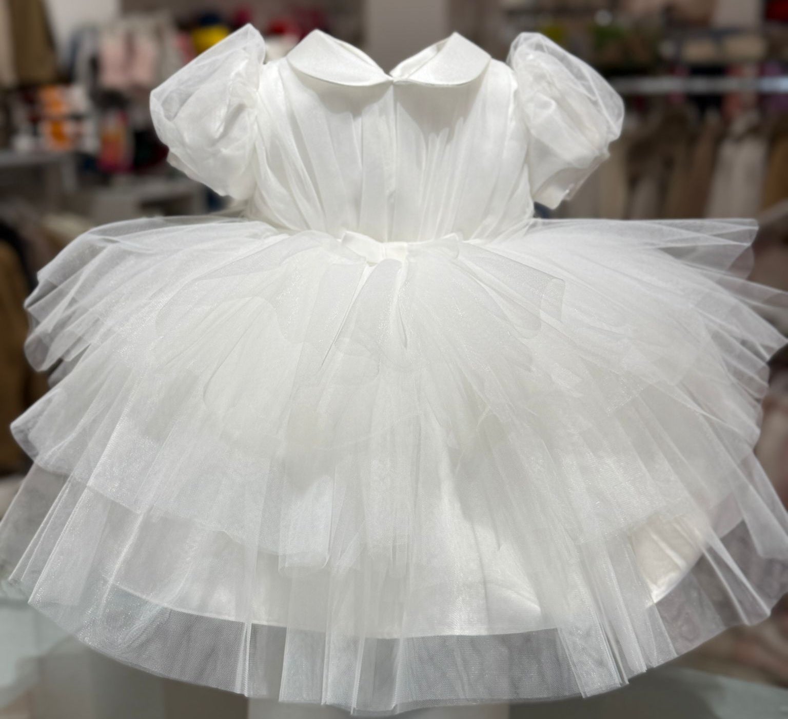 Bellissimo vestito per cerimonia bianco con balze in tulle, maniche a palloncino e dettagli di nastrino in velluto