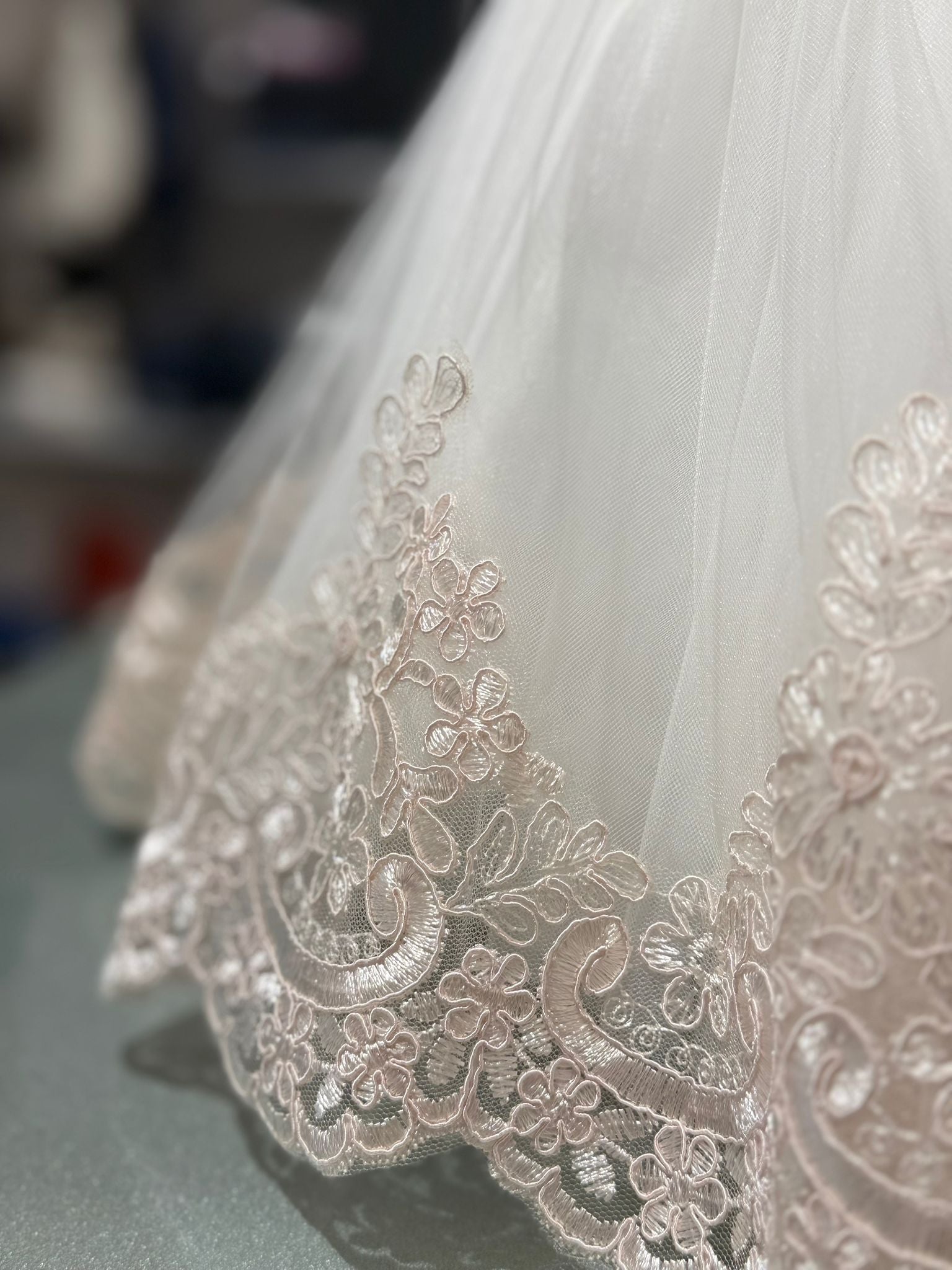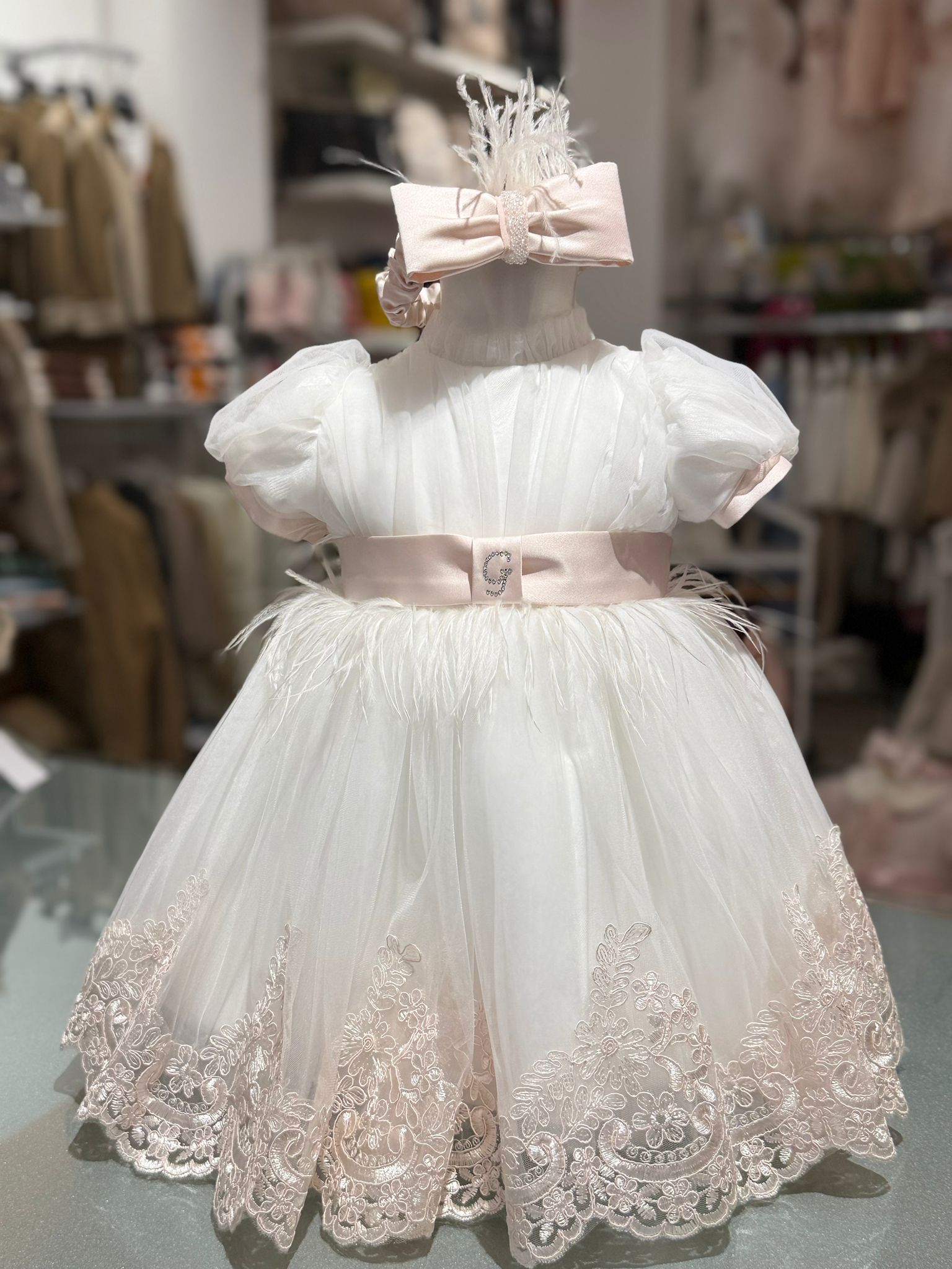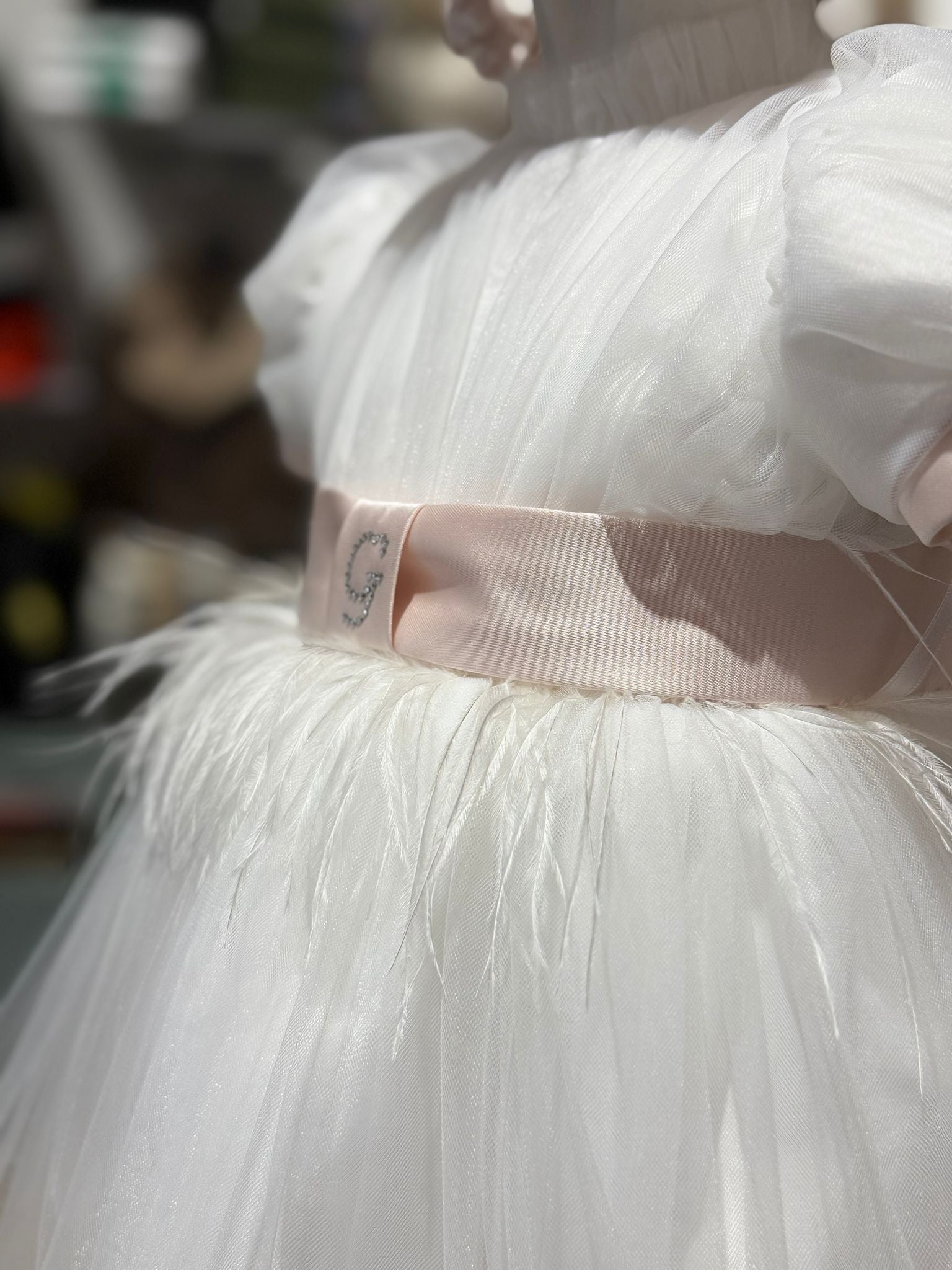 Bellissimo vestito cerimonia bianco con dettagli rosa. Rifinito con delicata pizzo rosa dettaglio piume in vita e sulla fascia