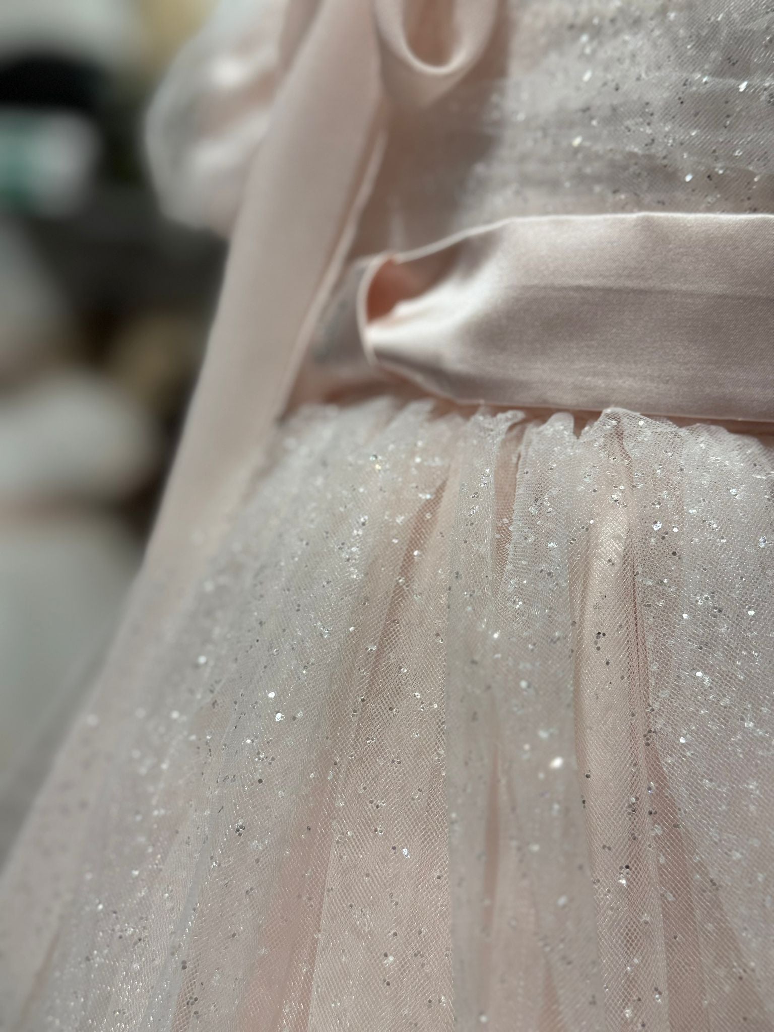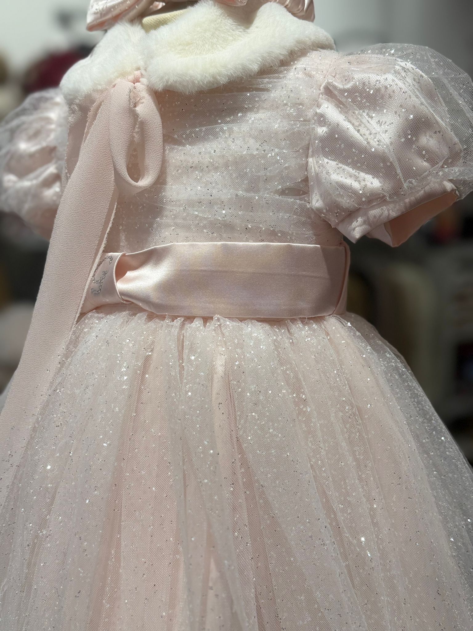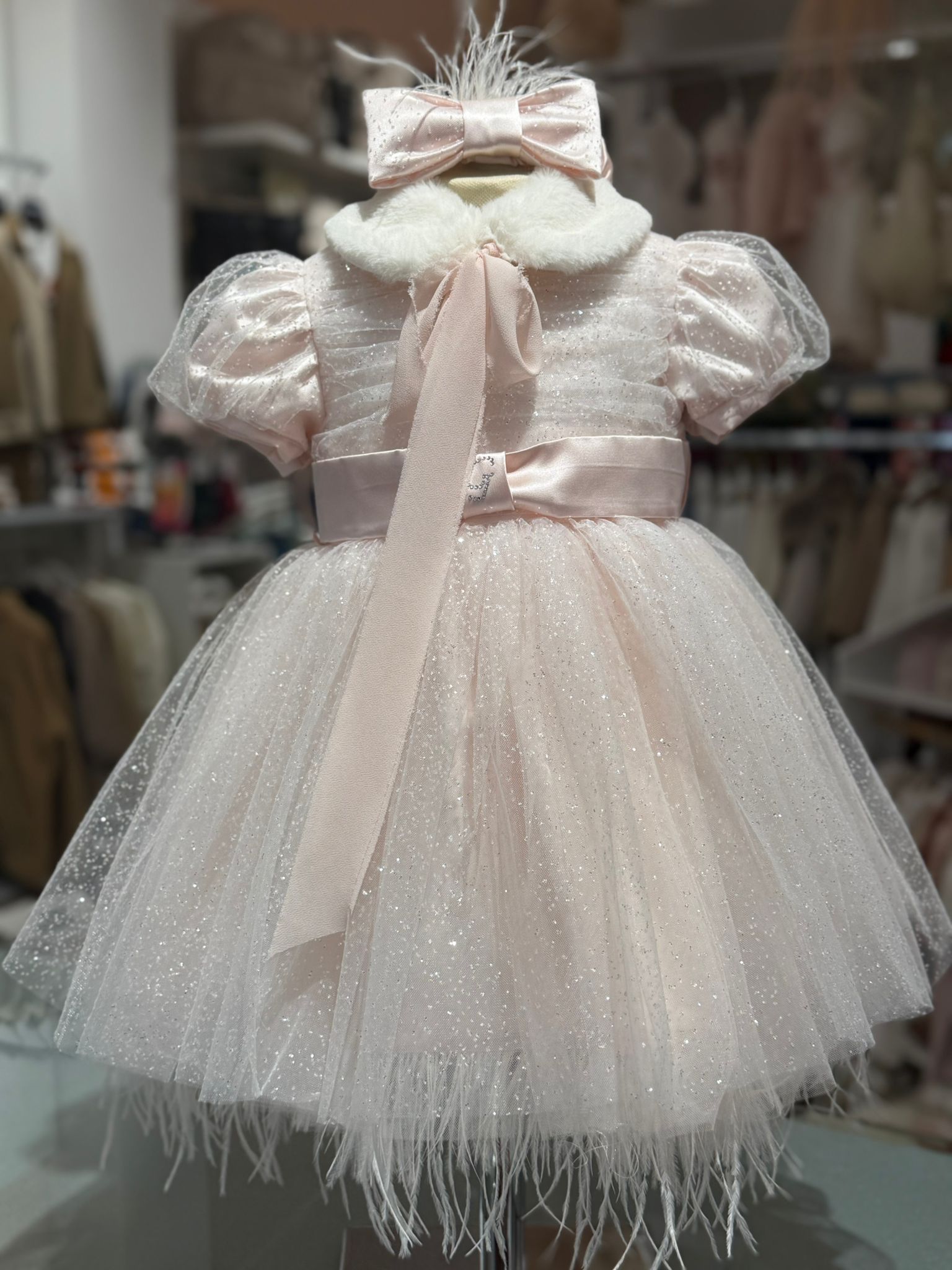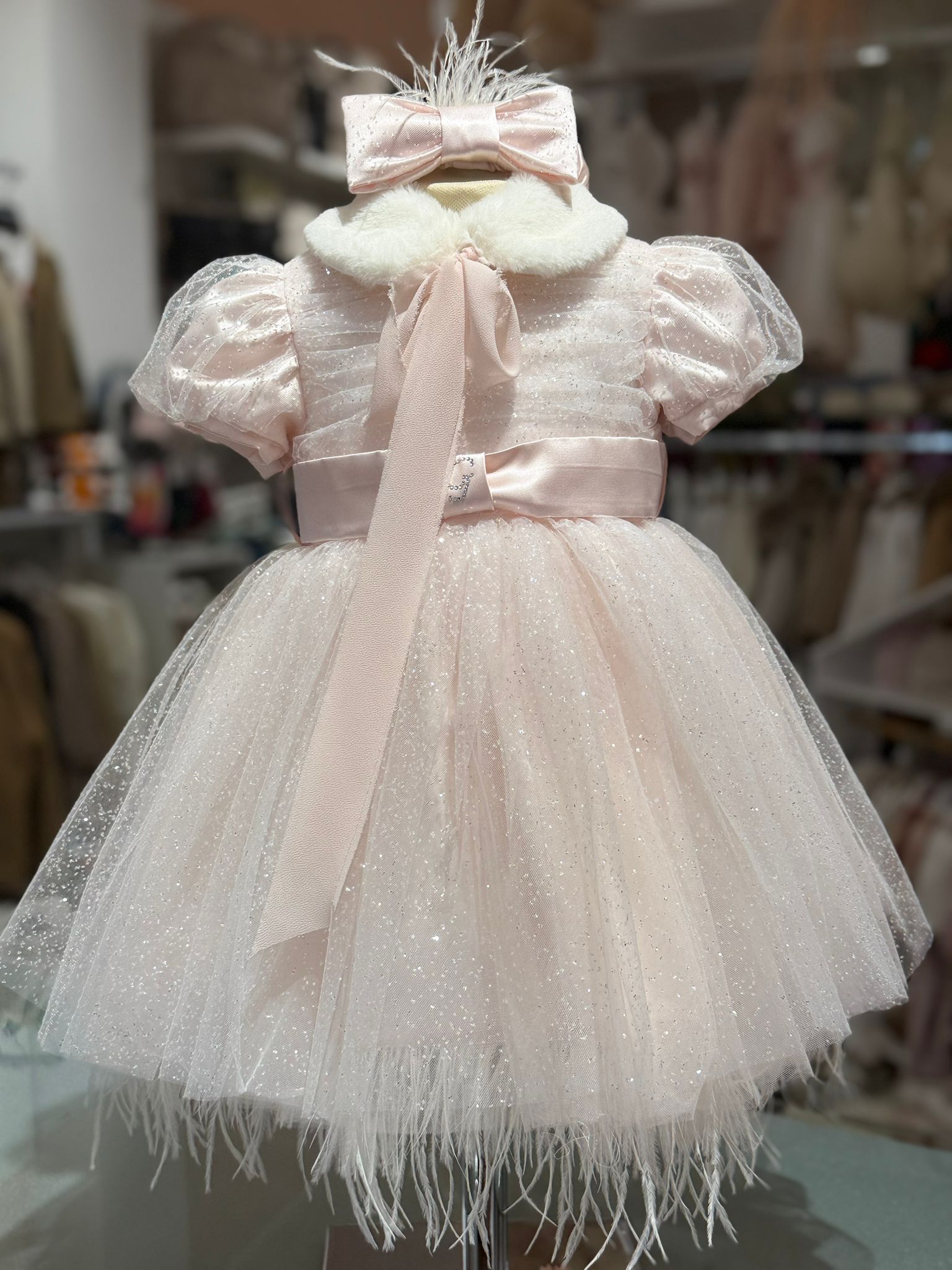 Vestito per cerimonia con tulle rosa cipria tempestato di punti luce collo in pelliccia estraibile, dettaglio piume sulla bordura del vestito e sulla fascia.